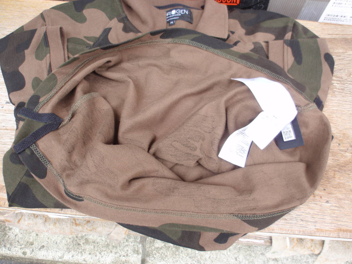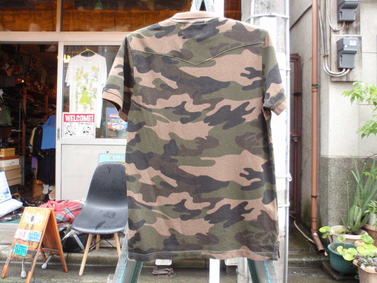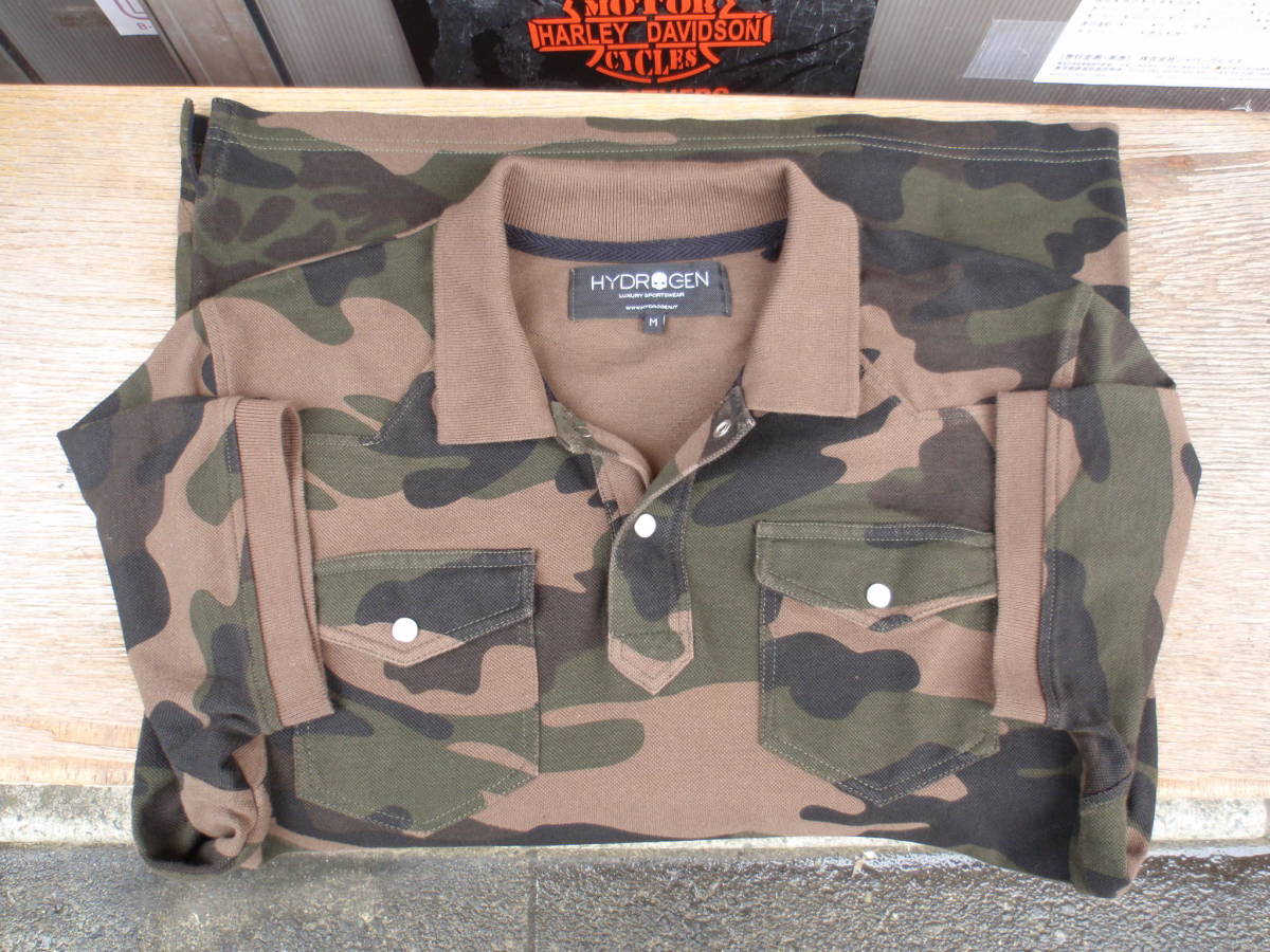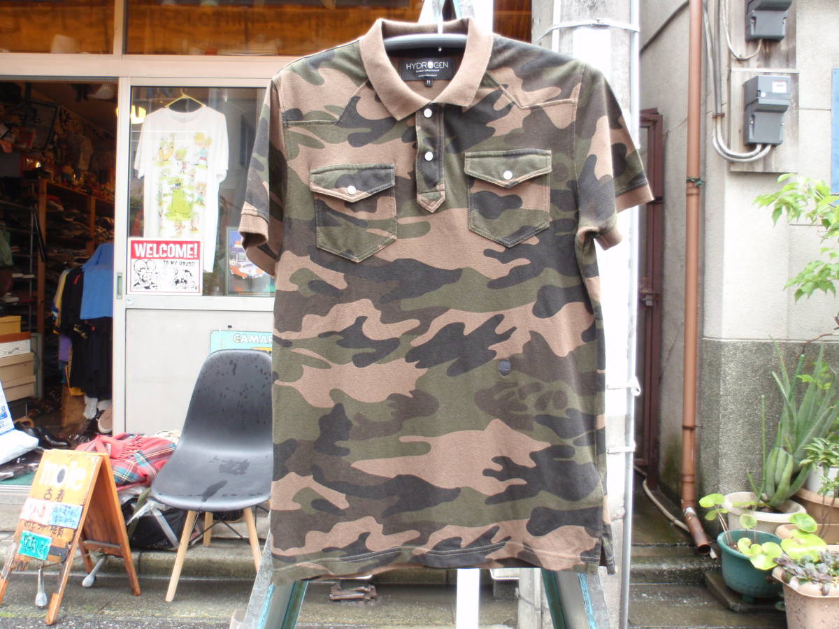 中古品ですので少し使用感ありますが、あまり使って無かったので目立った汚れや傷は無く状態は良いです。ハイドロゲンの迷彩柄なデザインポロシャツになります。サイズはM表記で、実寸では平置きで肩幅42センチ、身幅50センチ、着丈72センチ位です。三喜商事 正規品。