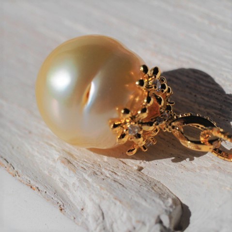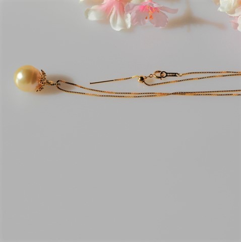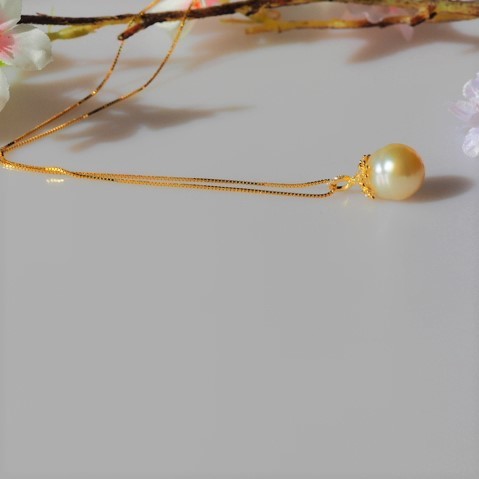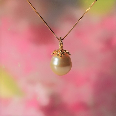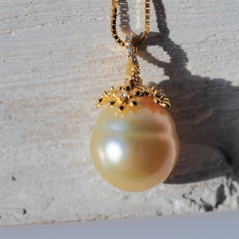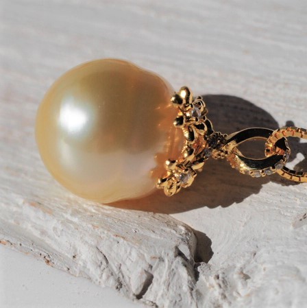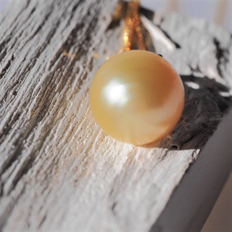 天然ならではのごく小さいくぼみがあるものの、ごく淡いゴールドカラーで、前面は自然の綺麗なゴールドの発色があり、強い照りと輝きを持った南洋真珠です