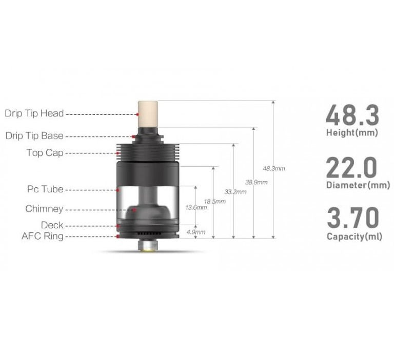 VAPE(電子タバコ)の高級メーカー"BP MODS"の "Pioneer RTA 22mm" アトマイザーです。 色は”DLC(ブラック)"です。 |