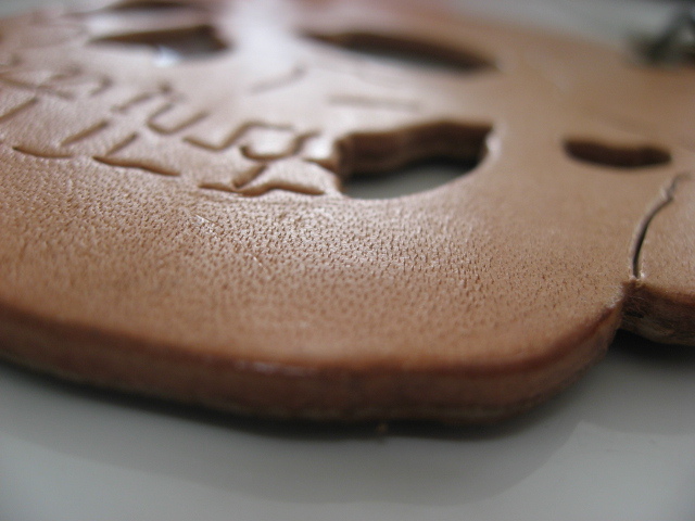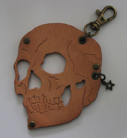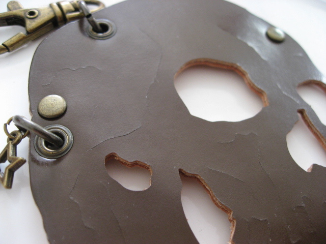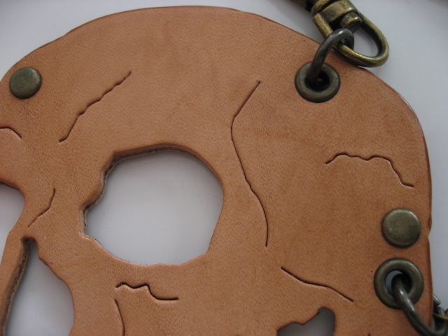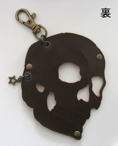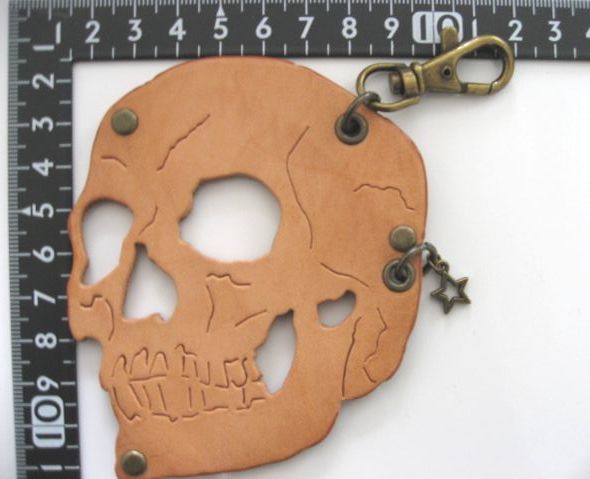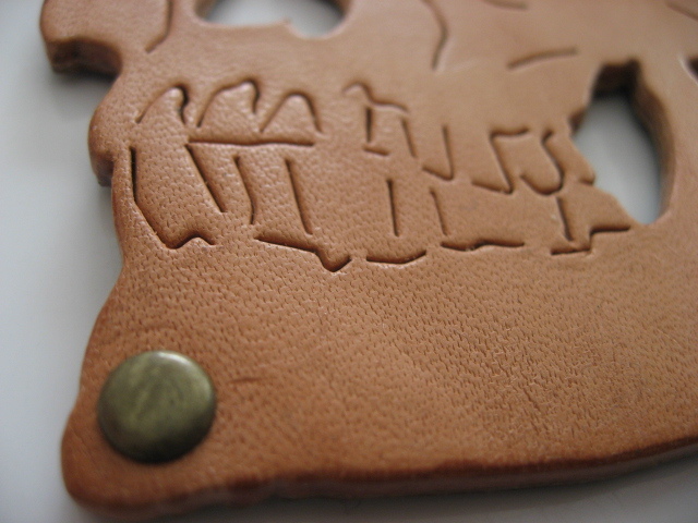 | 牛革のレザーキーホルダーです。大きさは、約10㎝×8㎝、厚さ2㎜、重さ20gほどです。素材は、牛革です。未使用ですが、革ですので、小さなキズなどがあります。 |