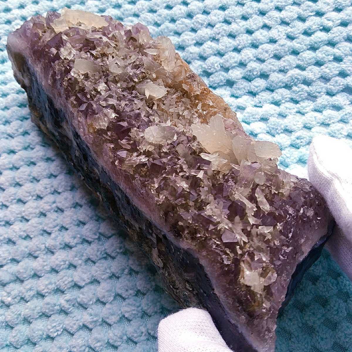 しっかり高さのある原石なので、側面ではアメシストのドラゴントゥース状の結晶の形や水晶の成長線がきれいに見れて楽しめます。