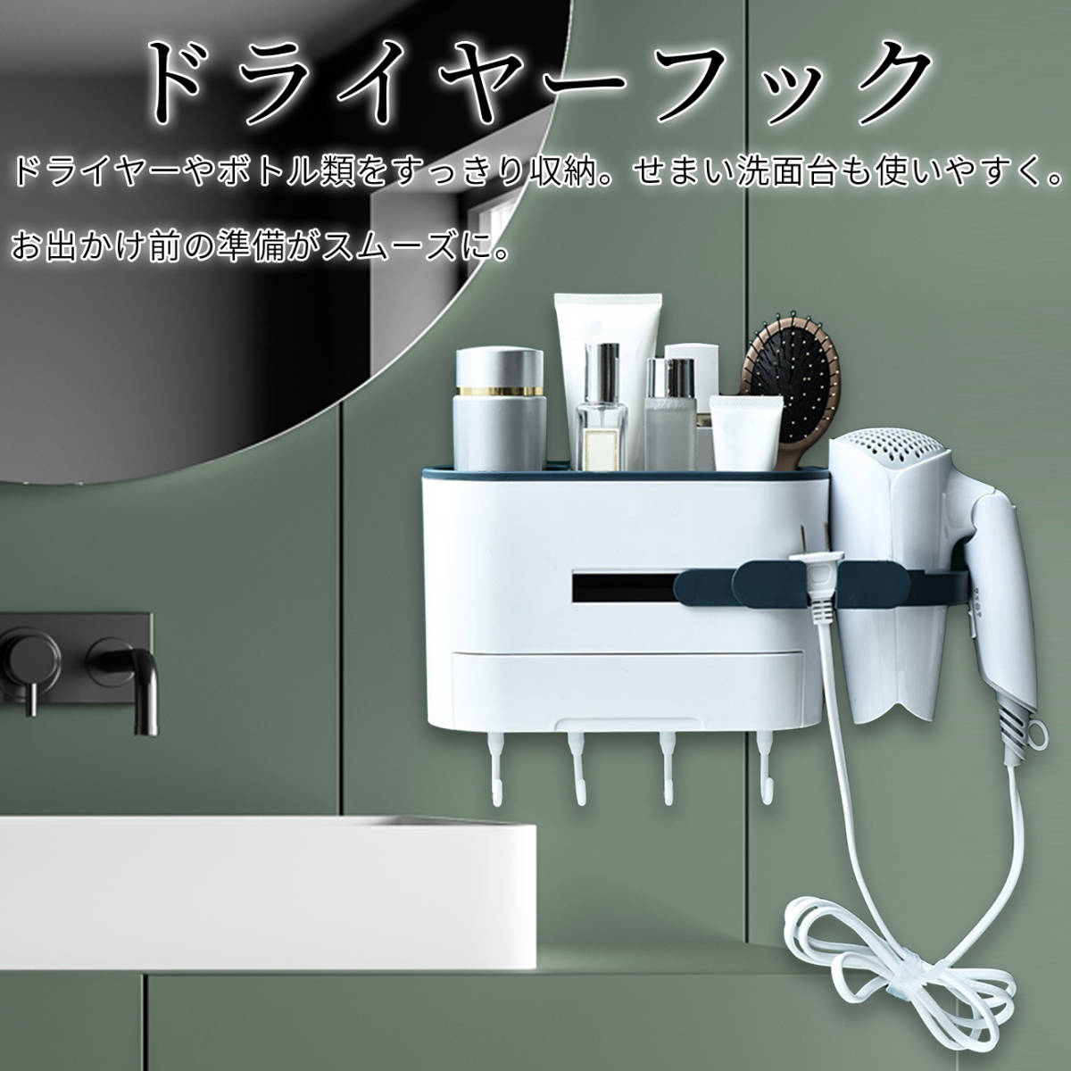 • 【ドライヤーをすっきり収納】せまい洗面台でドライヤーや化粧品をすっきりしまえます。ドライヤーは引き出したホルダーにひっかけるだけ。プラグかけも付いてコードがからみません。ボトル類は立ててたっぷり収納。洗面台まわりがすっきり。見分けやすく取り出しやすいから、お出かけ前の準備がスムーズに。