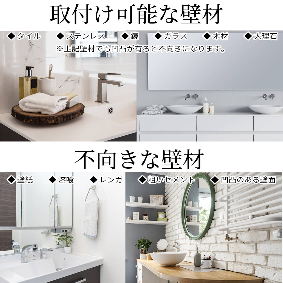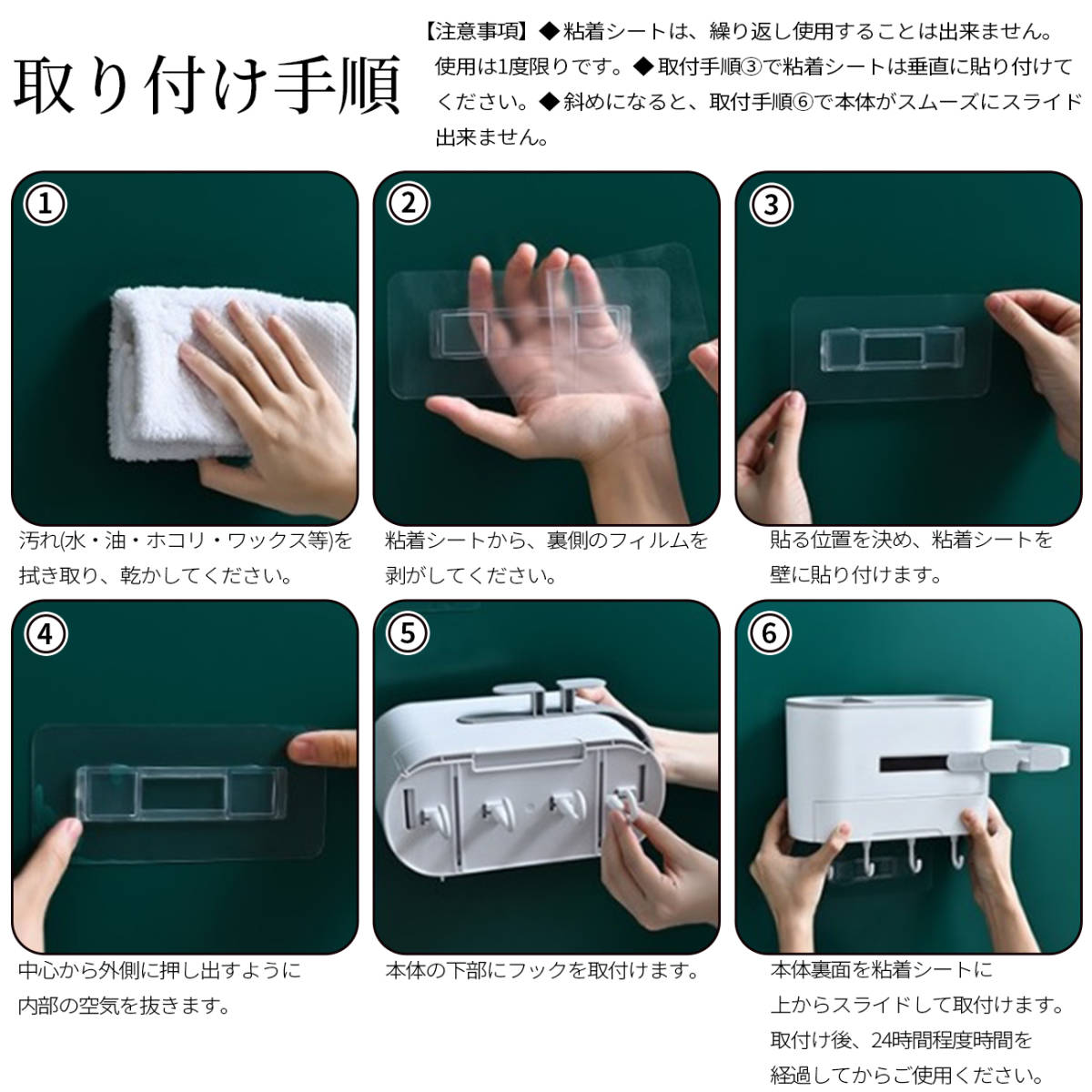 • 【壁に穴を開けません】壁に貼った粘着シートに本体をスライドして取り付けます。ネジを使わず壁を傷つけないので、アパート等の賃貸住宅にもお使いいただけます。タイル、鏡等の凹凸のない壁材向きです。