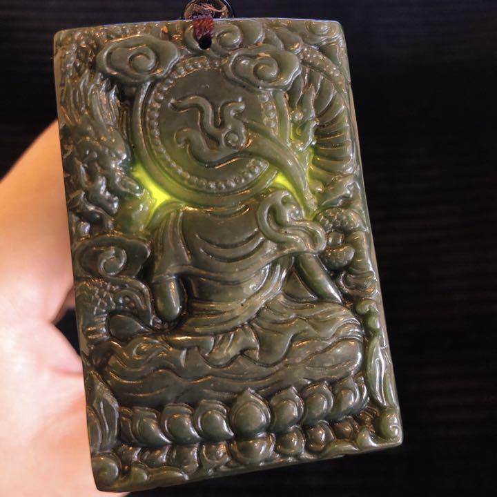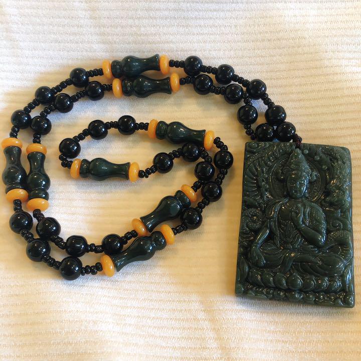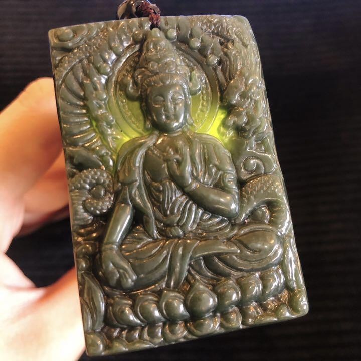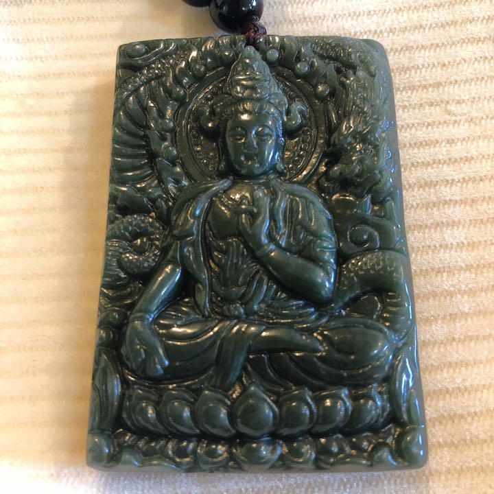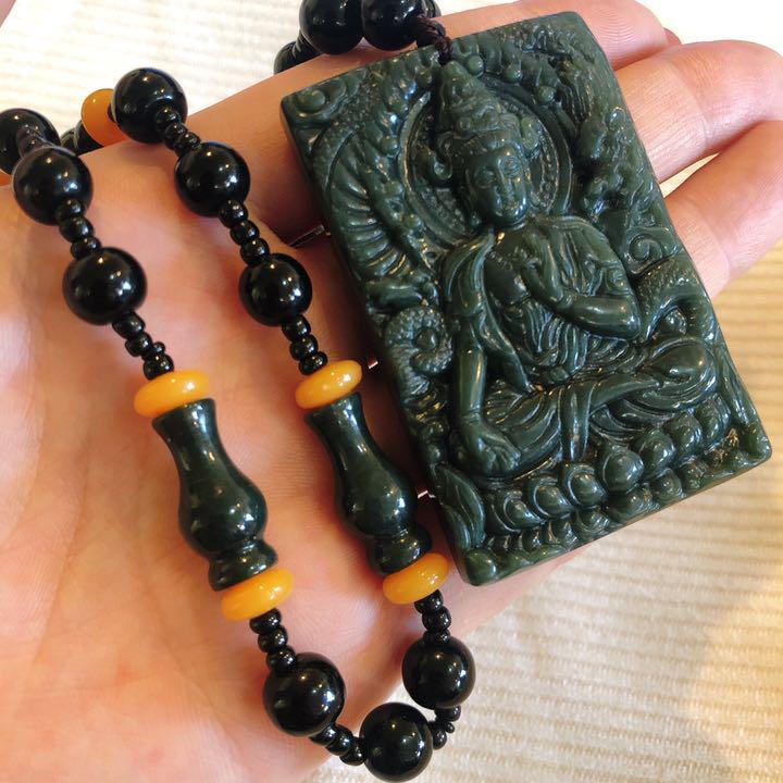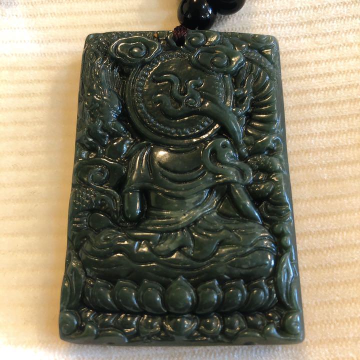 0503 パワーストーン 天然石 御守り 翡翠 和田玉 ネフライト 軟玉 彫刻 仏像 ネックレス ペンダント アクセサリー 新品(一つひとつ手作りのため、キズ・汚れなどございます。) 一つひとつ職人さんの手作りです。 天然石なので、全て1点もの。 同じものは一つもありません。 この高い工芸技術に魅了されてしまいますよね。 和田玉(ほーたんぎょく)は、中国で採取される翡翠(ヒスイ)です。 中国の「国石」である軟玉(ネフライト)に分類され、軟玉の中では比較的硬いため、繊細な彫刻が可能で、保存もしやすいです。 知恵と安らぎの象徴「ネフライト」は夢を叶える石、ドリームクリスタルとも言われています。 心身ともに深い癒しを与えてくれます。 また、洞察力や思考力を高め、判断力が冴え渡ります。 古来より人生の成功と繁栄をもたらす石として大切にされてきました。 仕事運を高めたい方は、アクセサリーとして身につけたり、デスクに置いたりするのをお勧めします。 石は人類にとても関わりのあるものと知っていますか? 人類は石に守られ、助けられてきました。 石がなければ、私たち人間も存在していないかもしれません。 そのため石は御守りとして現在も大切にされているのでしょう。 現在はたくさん取れる石も、だんだん希少になっていきます。 お部屋に飾っても良いですし、アクセサリーとして身に付けたり、みなさまの守護石としていかがでしょうか。 【浄化・メンテナンス方法】 ペンダントトップをお水で洗い、お水に浸けて水分を吸収させてください。 そうすることで、汚れが落ち、素材も傷みにくくなります。 長期間使用されない場合、お石が乾燥してきますので、たまにお水に浸してあげてくださいね。 【サイズ】 縦 約58.7mm 横 約38.7mm 厚み 約10mm チェーンの長さ 約64cm ※多少の誤差はご了承くださいませ。 *チェーンも軟玉を使用しています。 *箱付けで発送させていただきます。 *念の為に石の専門家に鑑定していただいています。 鑑定書など必要な場合は別途費用がかかりますので、ご相談くださいませ。