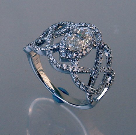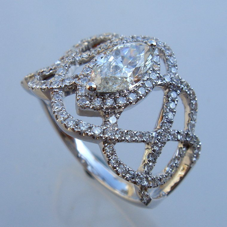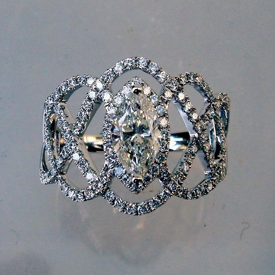 大粒でマーキスの周りを華やかにメレダイヤのラインが絡みつき、非常に満足感ある一品と仕上がっています。