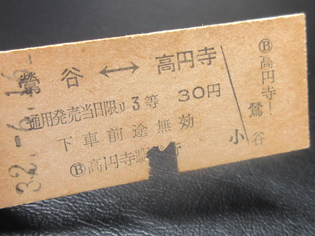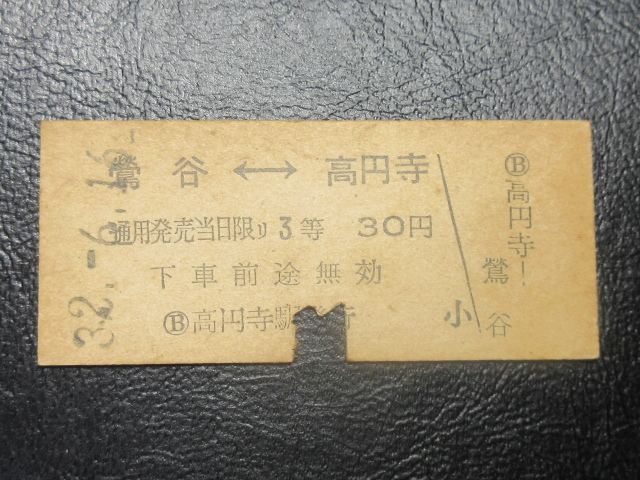 ~ ★国鉄乗車券・硬券『昭和32年6月16日・鶯谷←→高円寺・30円・矢印式乗車券』キップ切符・レトロ・アンティーク・コレクション★JNR987 ~
