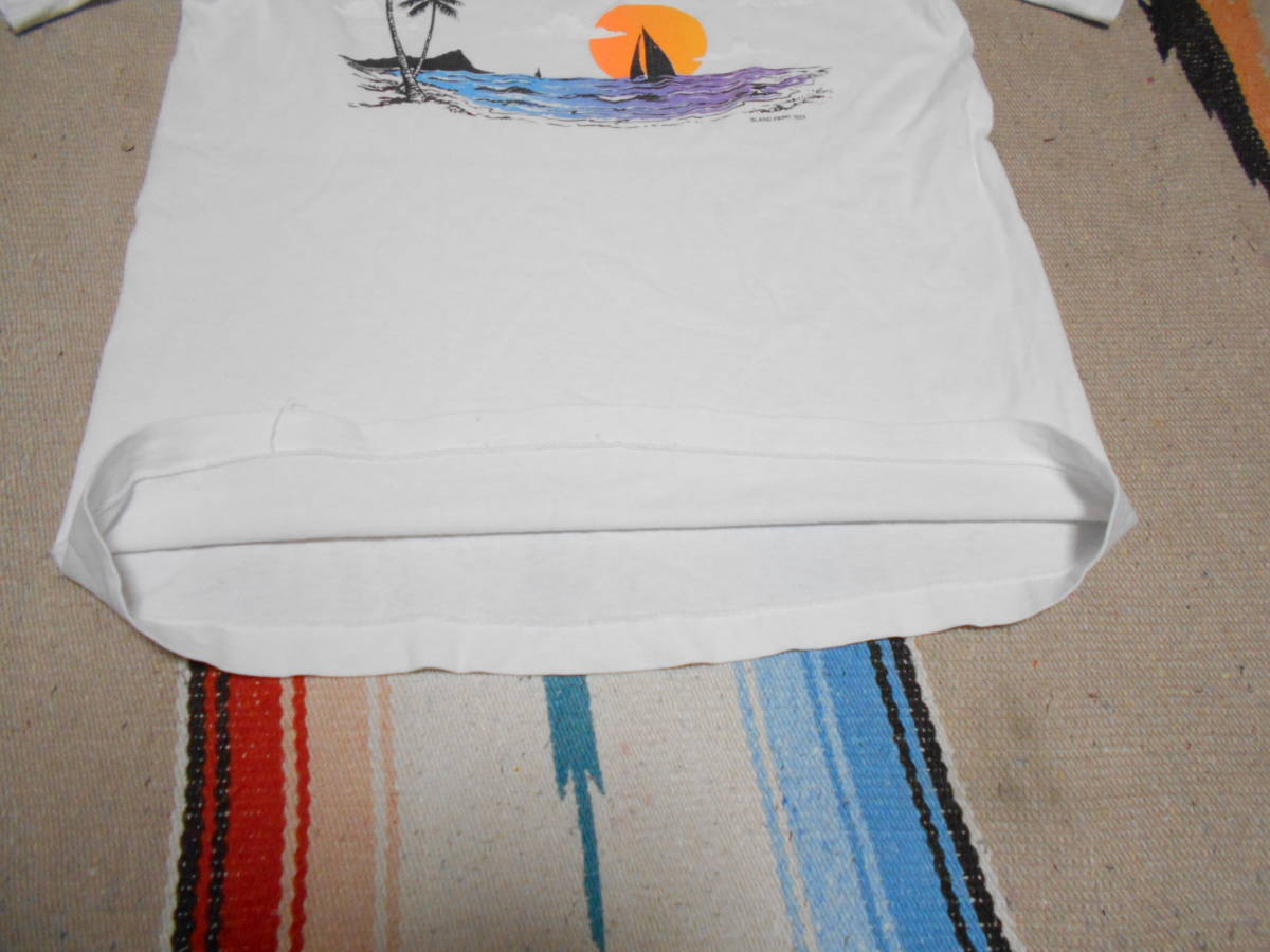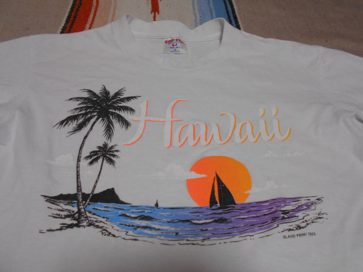 EARLY1990年代 ハワイアンオールドサーフアイテムらしい、トロピカルなパームツリーにセイリングボートグラフィックデザインにブルー~パープルグラデーションの幻想的オーシャン、 HAWAII クラシックフォントロゴが極めて良いテイスト