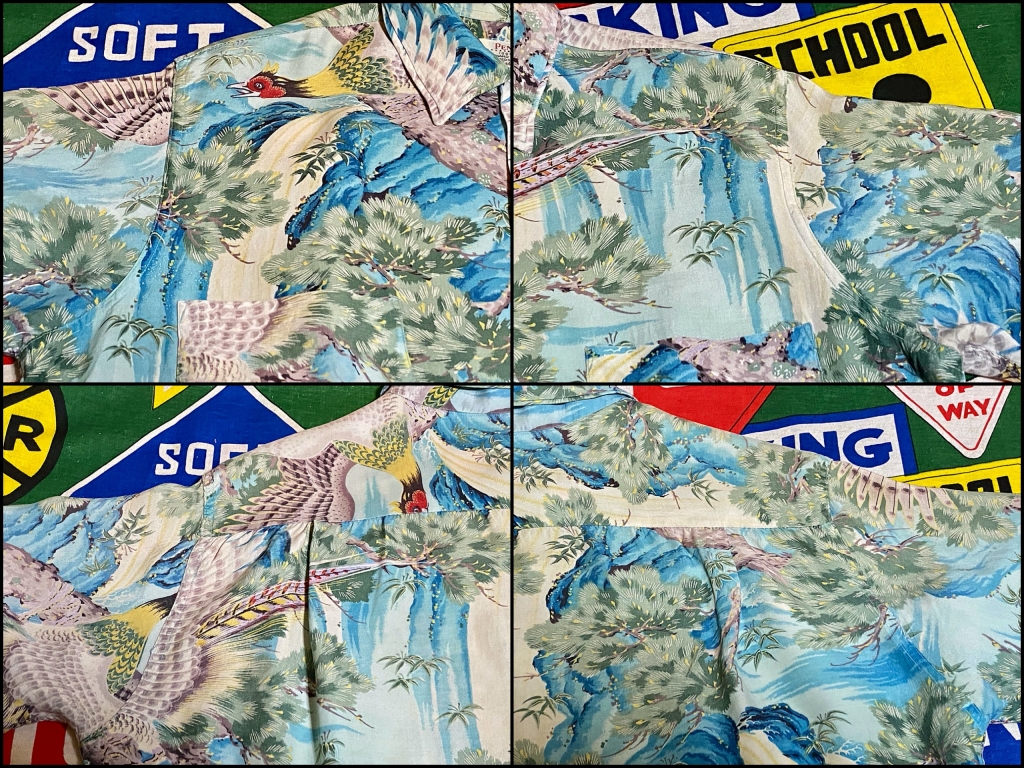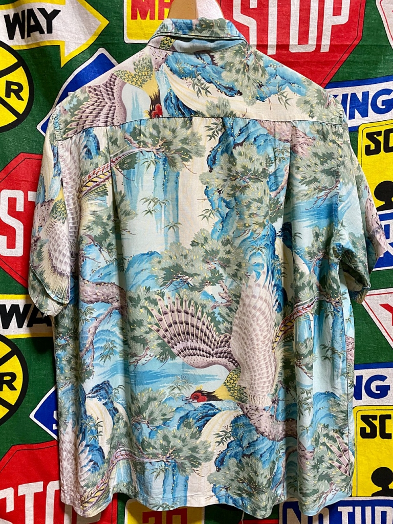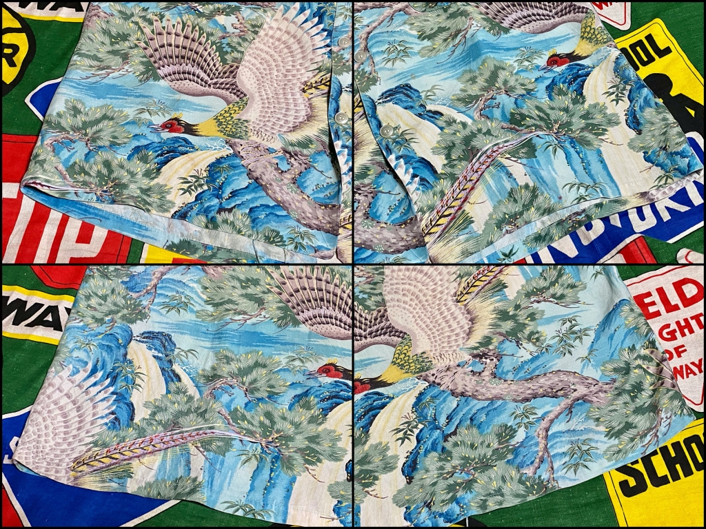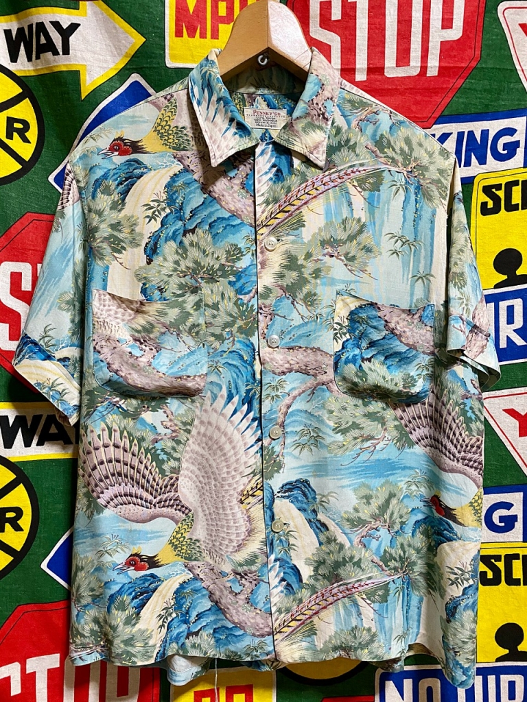 大迫力なキジと松のプリントがインパクト大な1枚で、これからのシーズンにもオススメな1950年代頃のビンテージレーヨンプリントハワイアンシャツです。