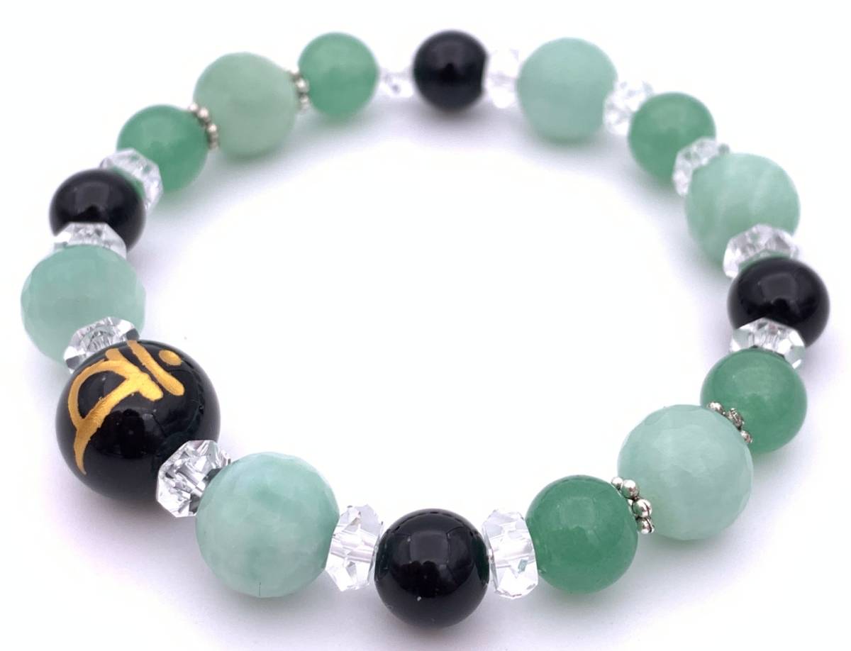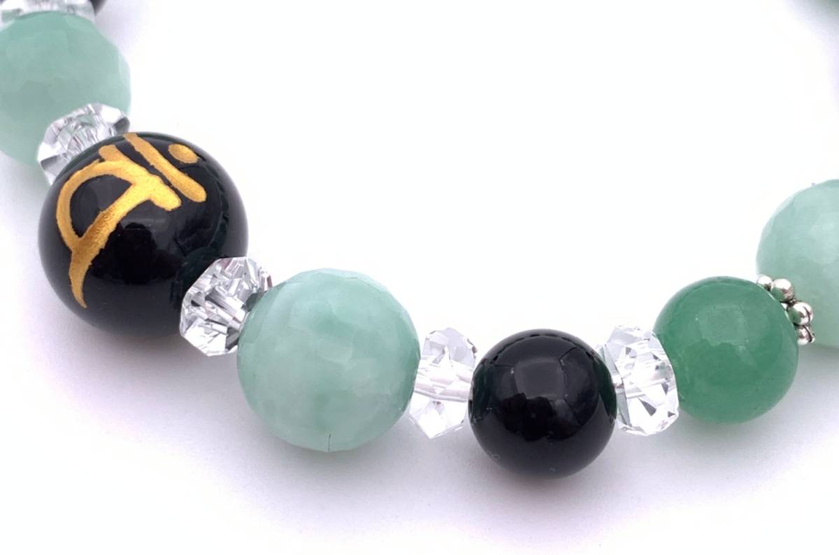 天然石オニキス守護仏梵字金彫り12mm玉&オニキス&カルセドニー&アベンチュリンのブレスレット