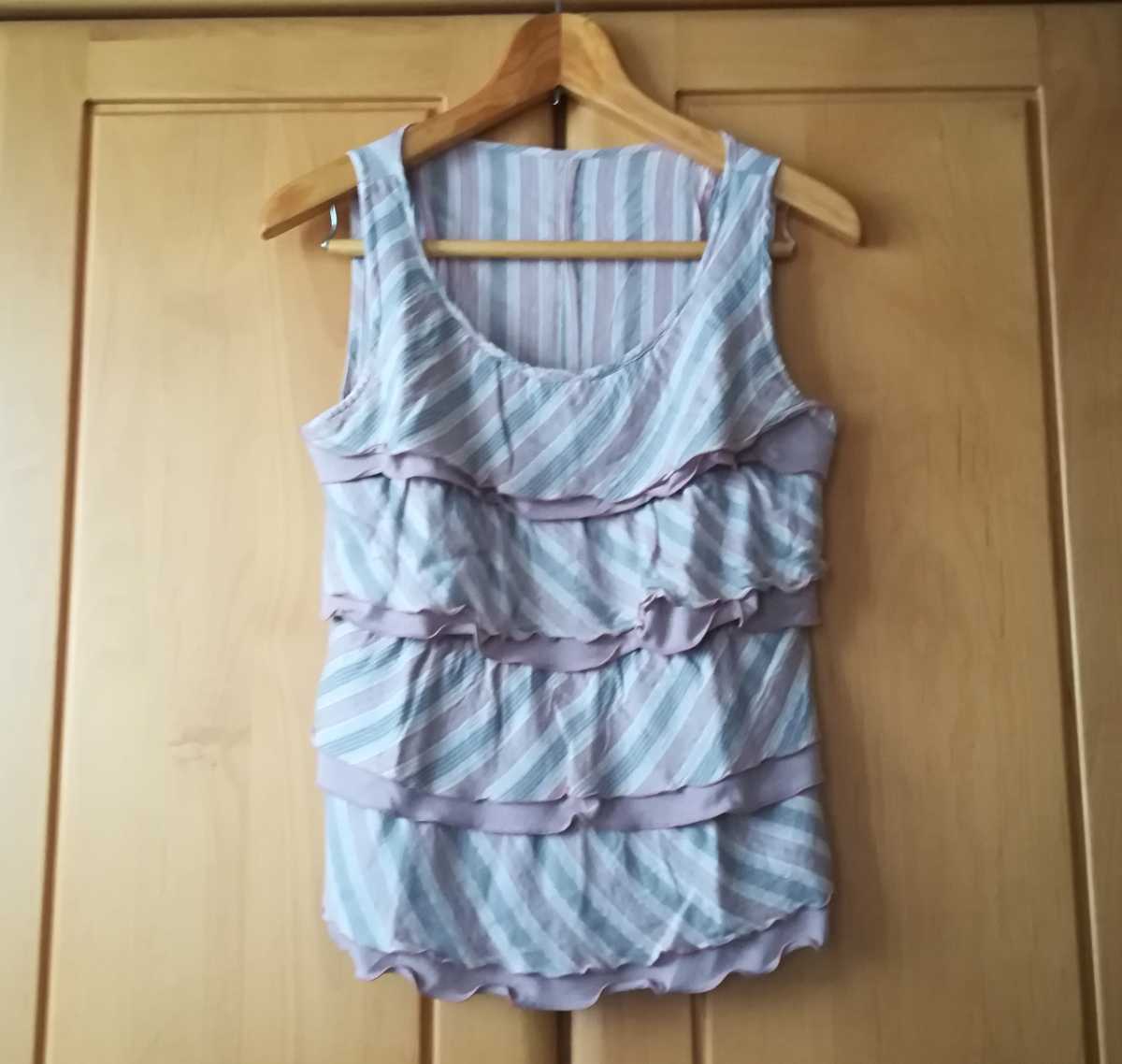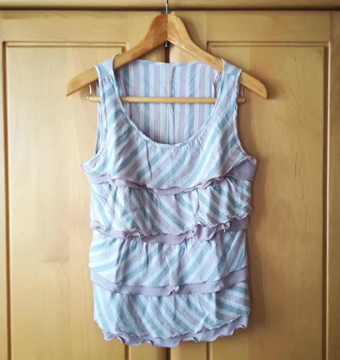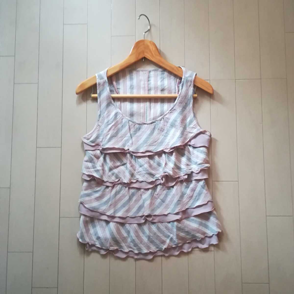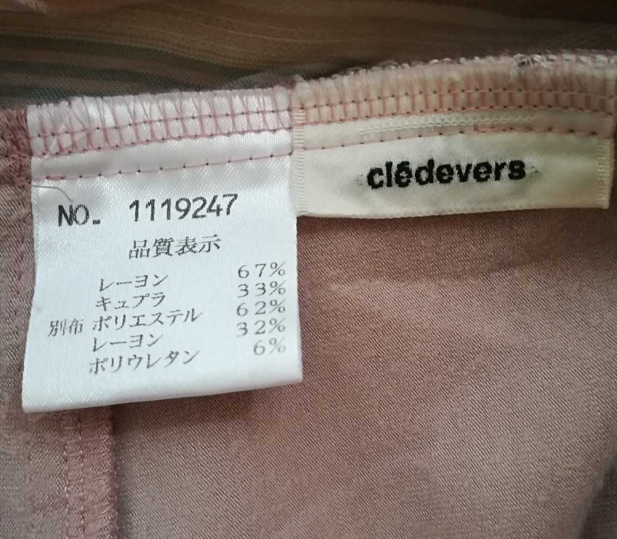 cledevers のスエットと、レーヨンの異素材の段々になったフリルが可愛いトップスです。