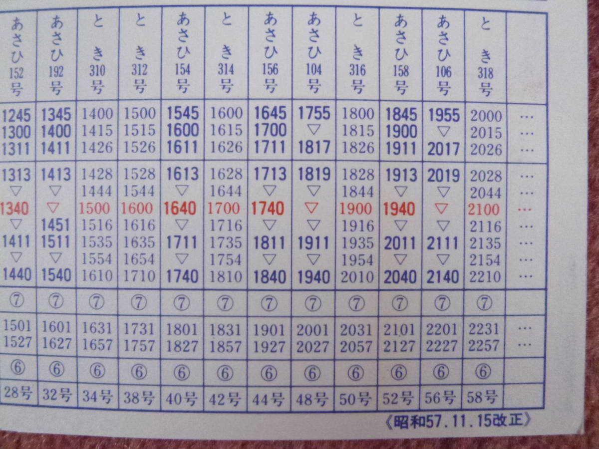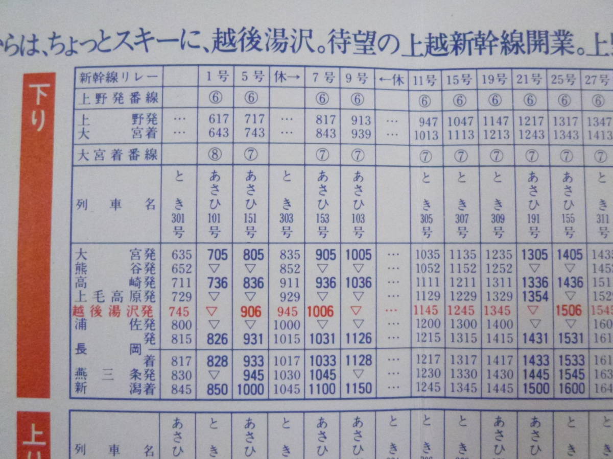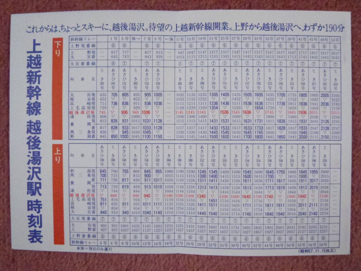 時刻表は、昭和57年11月15日改正分で上越新幹線開業時の越後湯沢駅のものです。