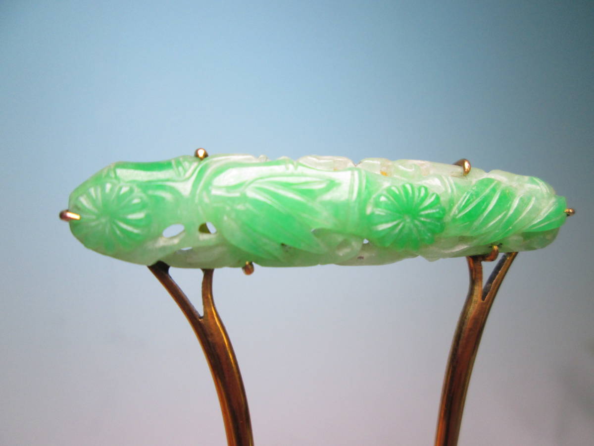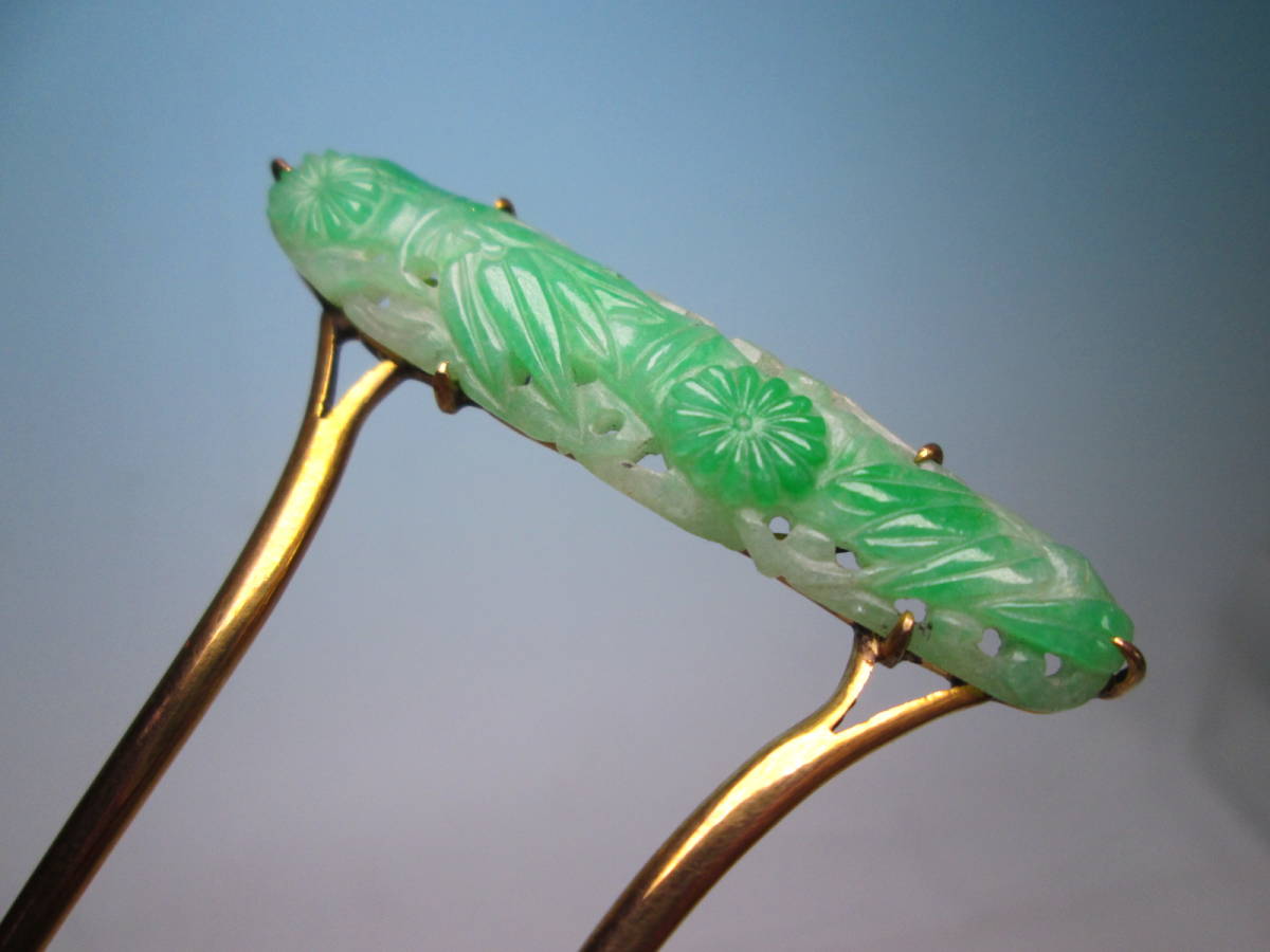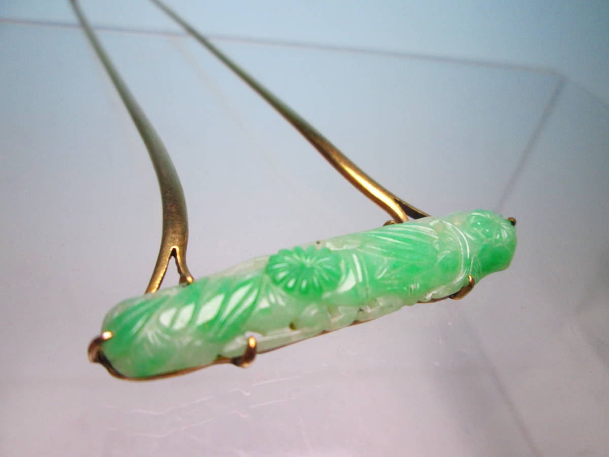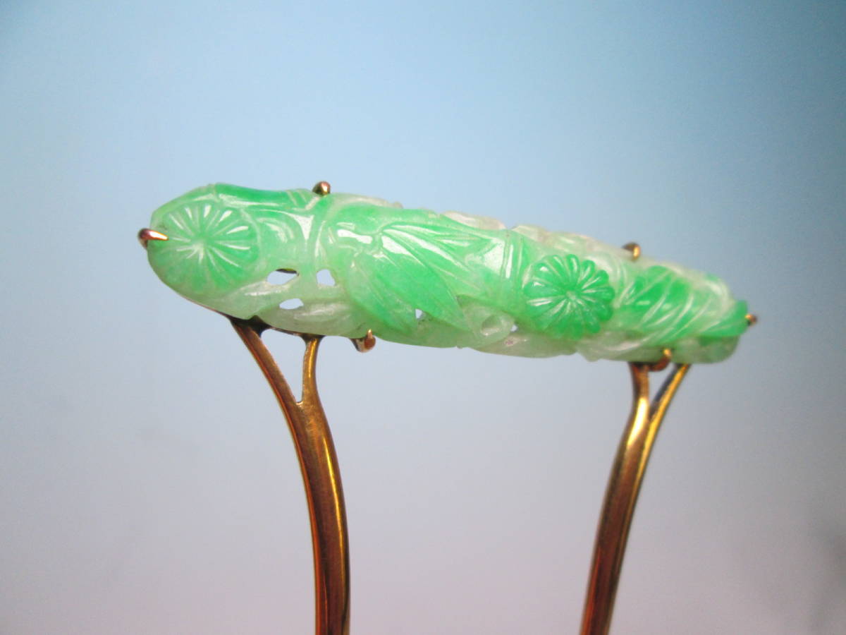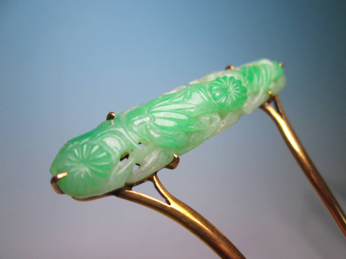 【江月】アンティーク・K10 本翡翠 花彫刻のかんざし 11,11g 共ケース付