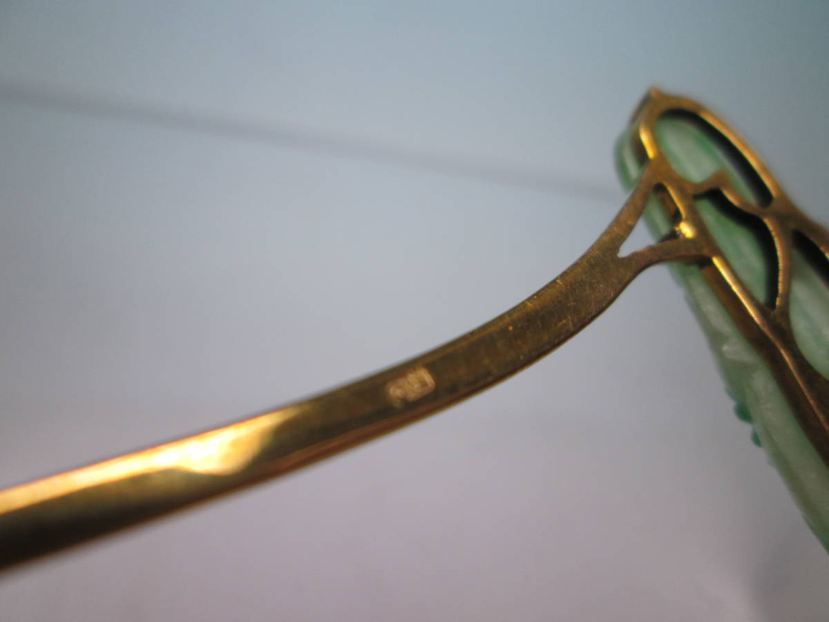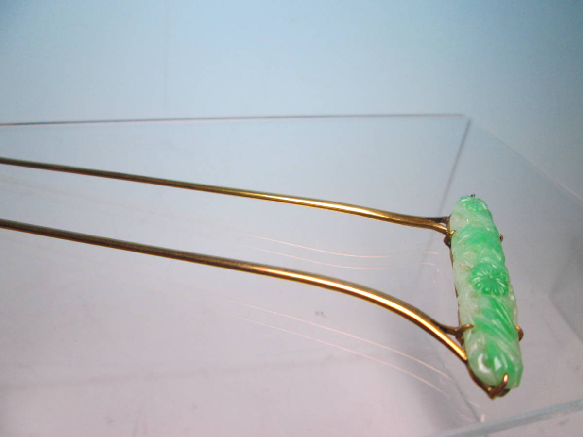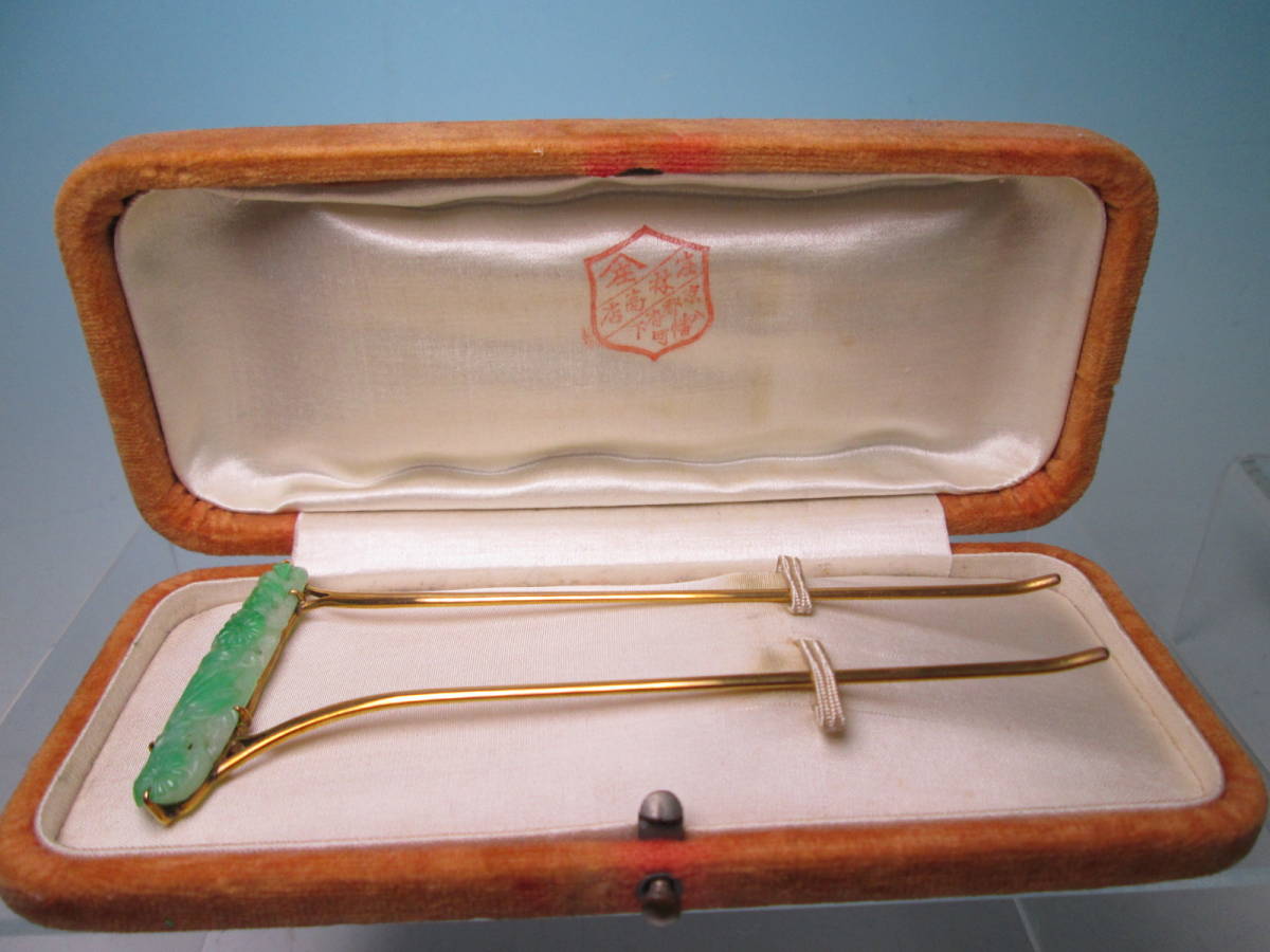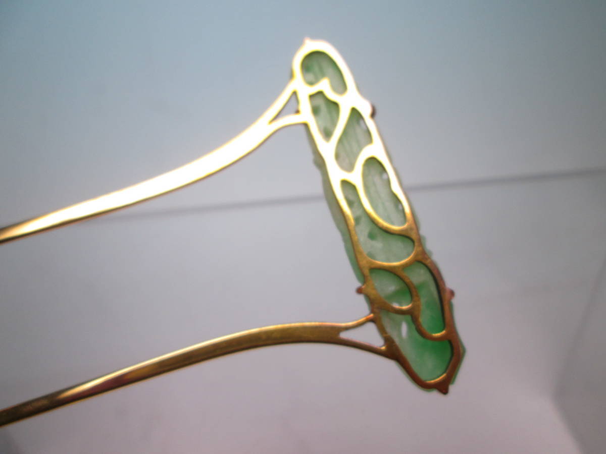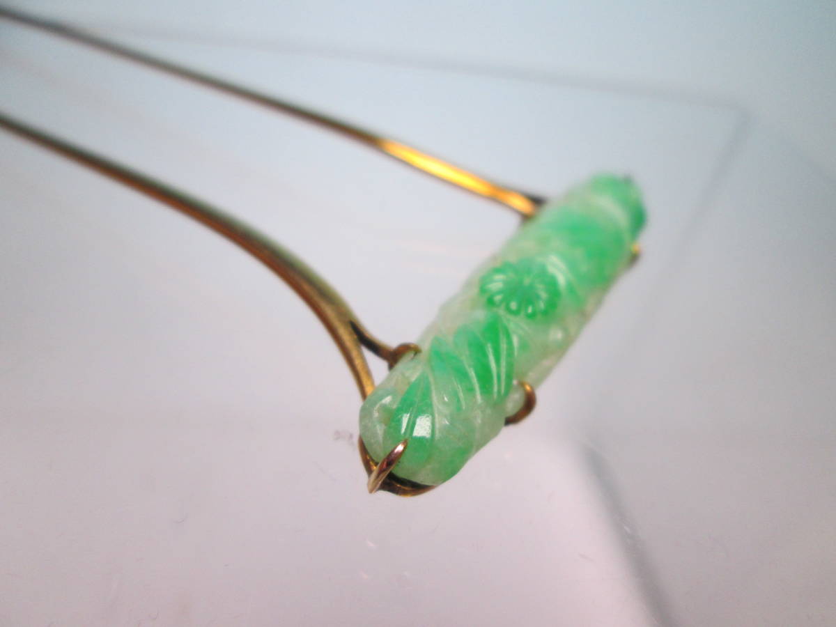 【江月】アンティーク・K10 本翡翠 花彫刻のかんざし 11,11g 共ケース付