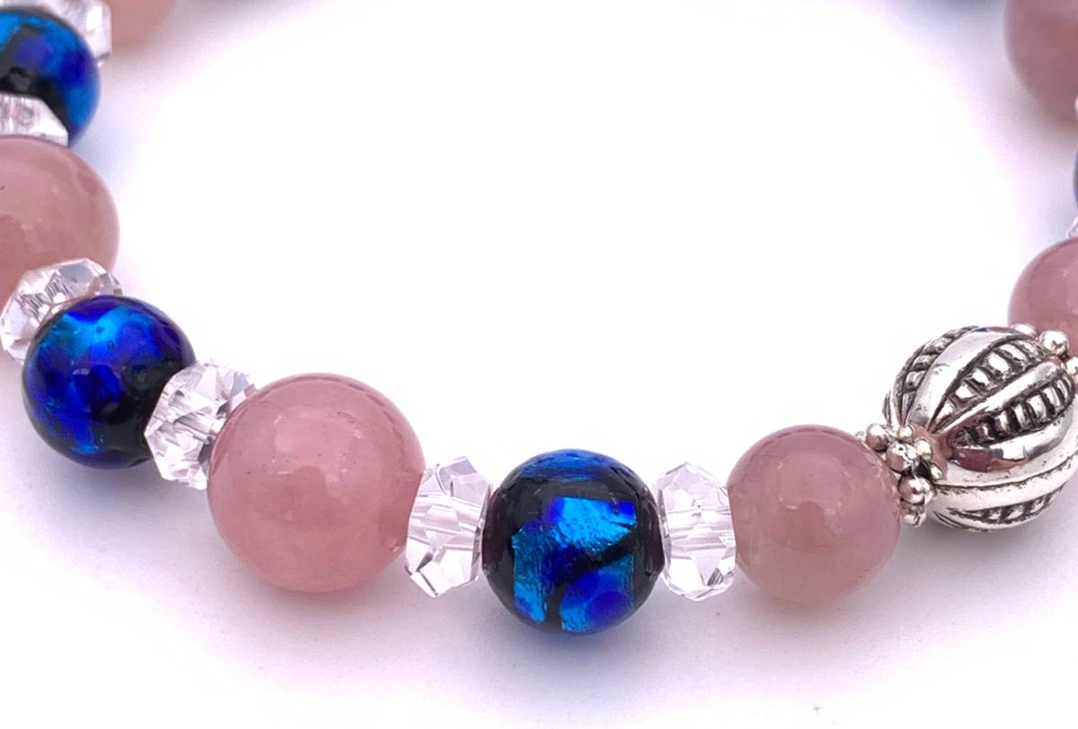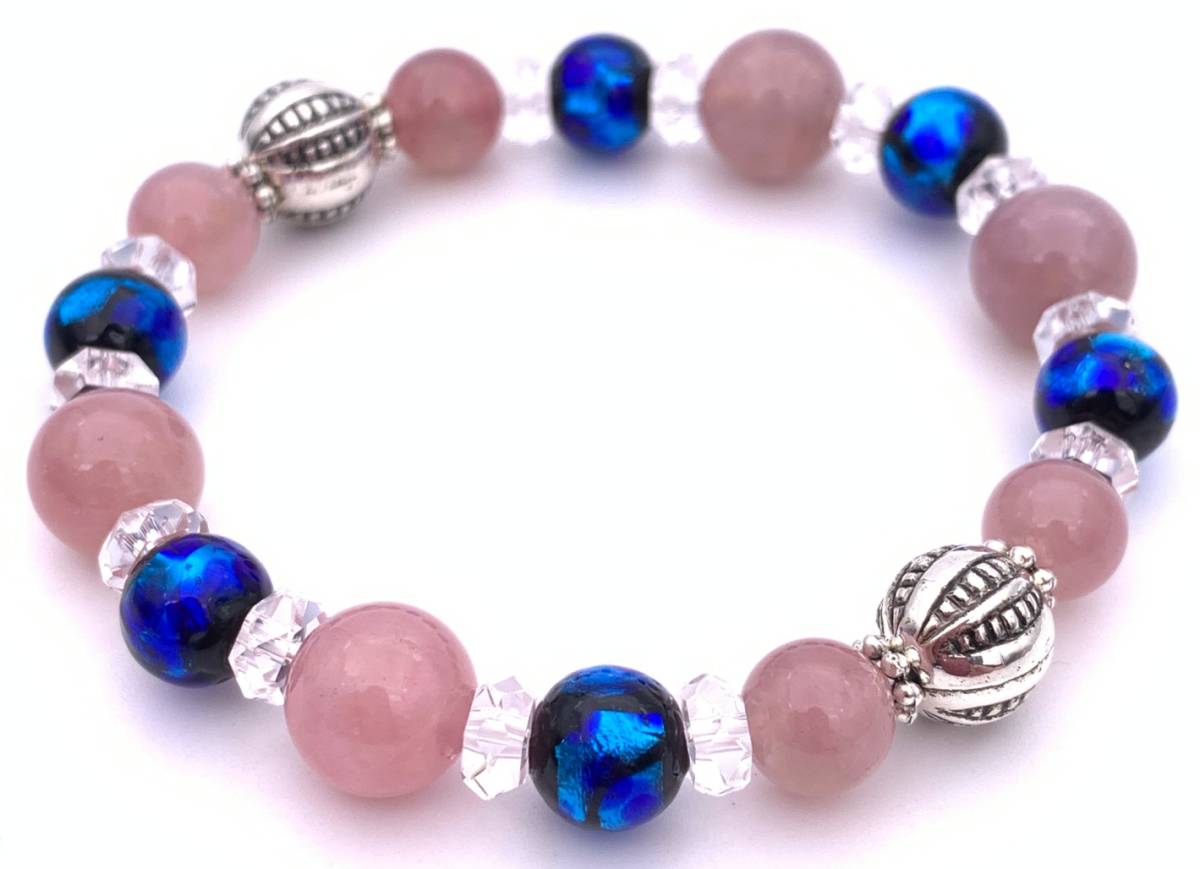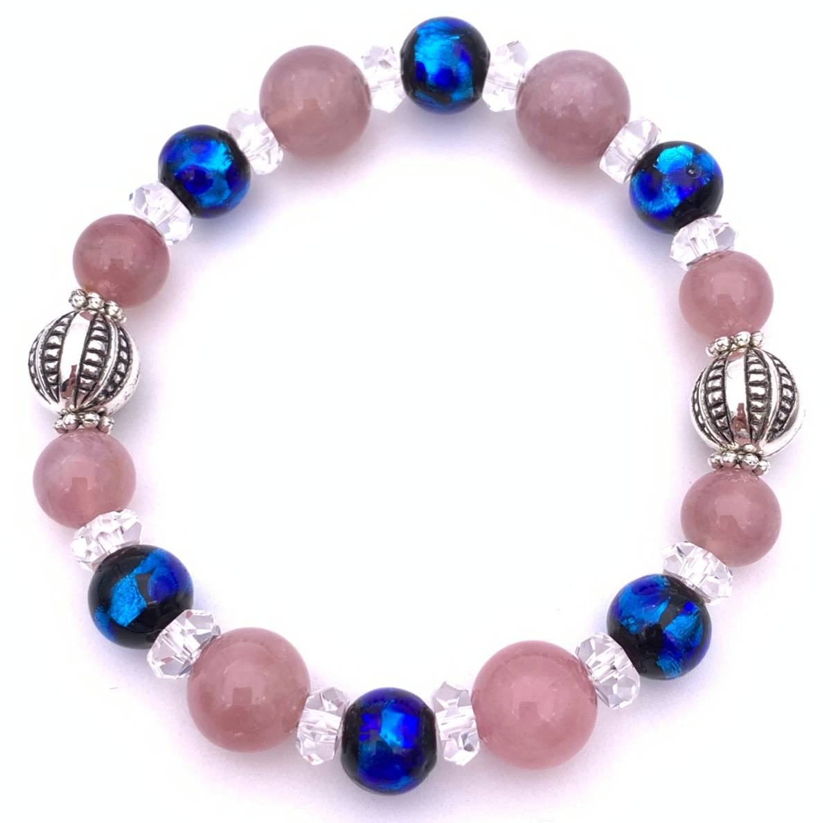 天然石ディープローズクォーツ&ホタルガラスのブレスレット