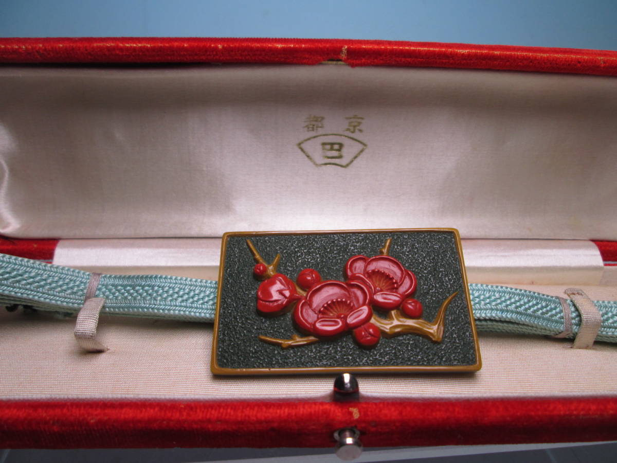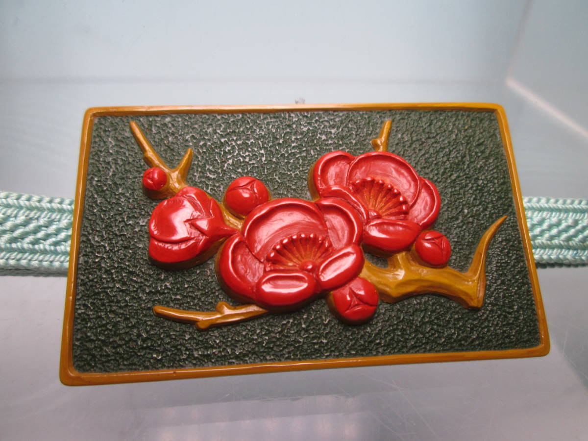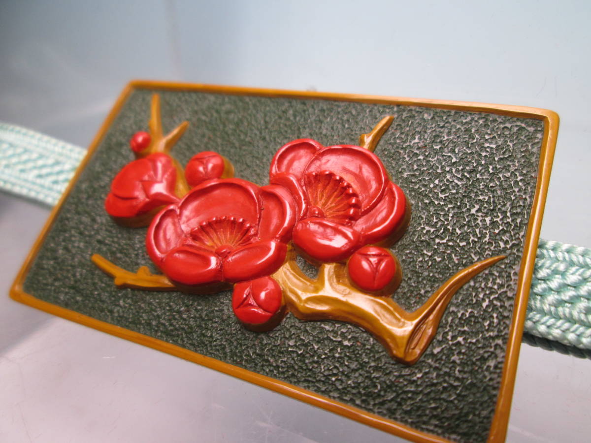 【江月】☆アンティーク・巴 清鳳作 本鼈甲 堆朱細工 紅梅の帯留め 共ケース付