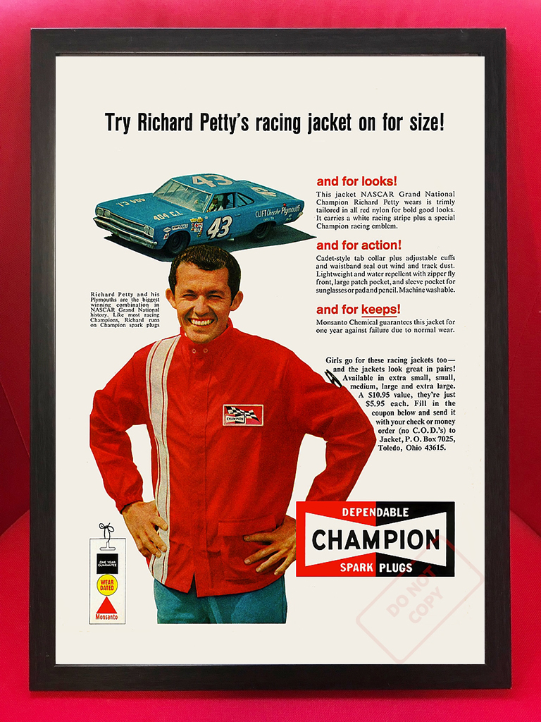 | "Champion Spark Plugs 1968 Richard Petty 's Plymouth No.43"Magazine Ad Poster USA 買付 限定数量 1968年のチャンピオンプラグの雑誌広告をレストアしたリプロダクションポスターです。(当時物ではありません) 1968年プリムス・ベルベデア #43とリチャード・ペティが着るレーシングジャケットがイイ感じの広告です。 ポスターサイズ:42cm × 29.7cm (額は付属しません。ポスターのみの出品です。額はA3サイズ用がピッタリです) こちらのポスターは高品質で厚みのあるアートペーパーに美しくプリントされたもので非常にハイクオリティなモノです。クラフト紙や布にプリントしたような粗い画質ではありません。存在感があり、しかも飾るのにも困らない絶妙なサイズですので、お好みのフレームに入れディスプレイするのにも最適です。また、しっかりとした厚みのあるポスターですので、そのまま無造作に壁などにピンでとめるディスプレイのスタイルもおススメです。 趣味の部屋・ガレージ・カフェ・ショップ・Bar・オフィスなどに! ※60's・70's・80'sを中心にマニアックな映画・旧車・バイク・音楽バンド関連などの様々なポスターを多数出品中ですのでチェックしてみてください! Click→映画関係ポスター Click→音楽関係ポスター Click→自動車関連ポスターA Click→自動車関連ポスターB Click→オートバイ関連ポスター Click→その他ポスター | ||