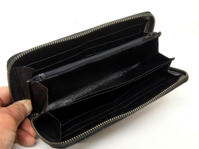 開閉口はファスナー、内にコインなど入れるファスナーポケット・しきりポケット・両サイドにカードが各6枚計12枚入るカードポケット・