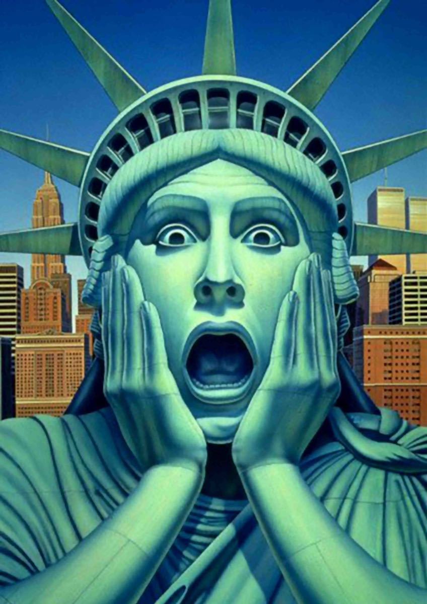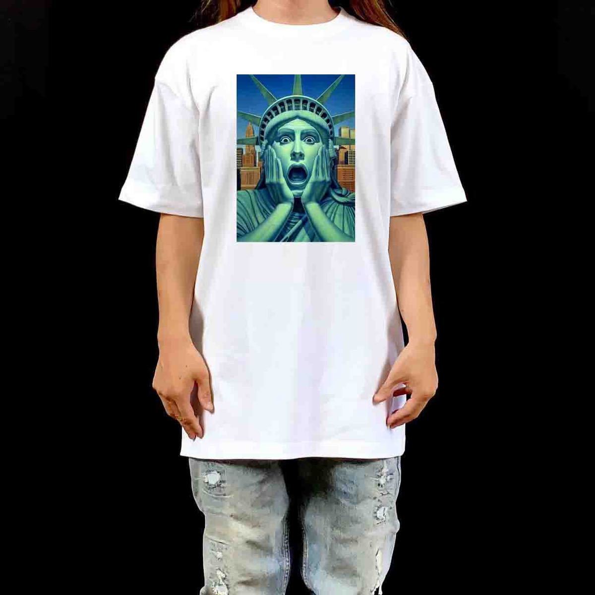 アメリカ、ニューヨークの象徴的な自由の女神のビックリ顔文字がポップなアメコミテイストのイラストデザインです。