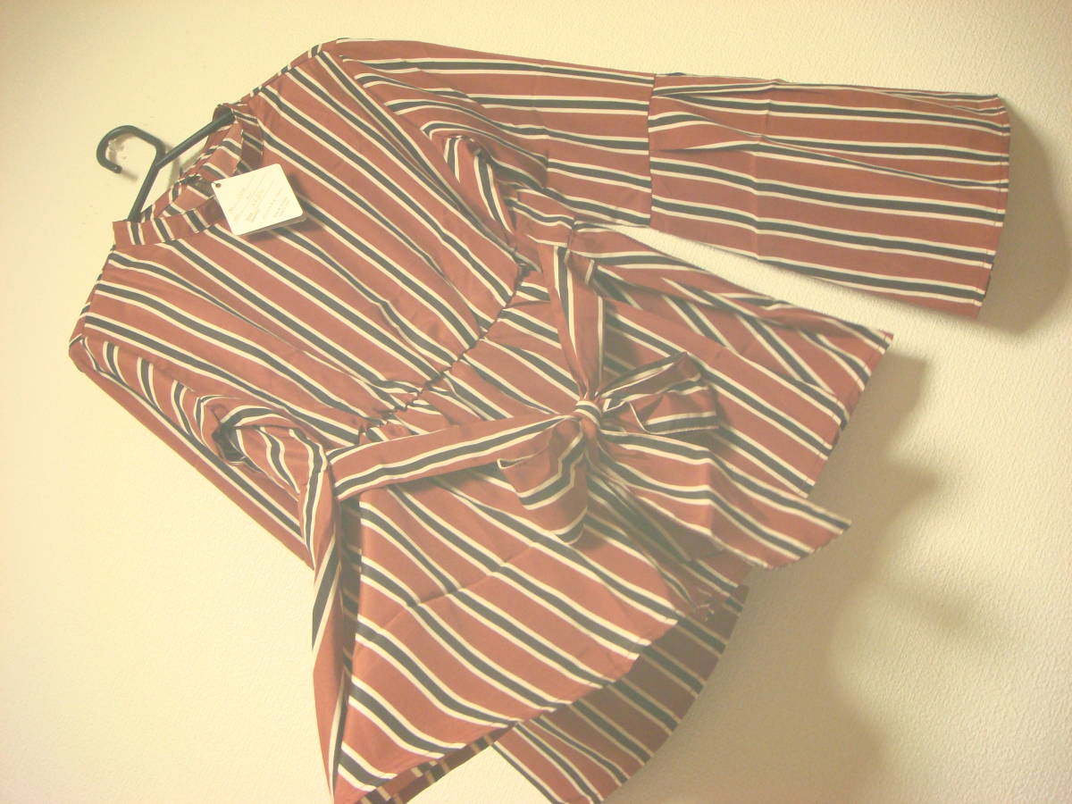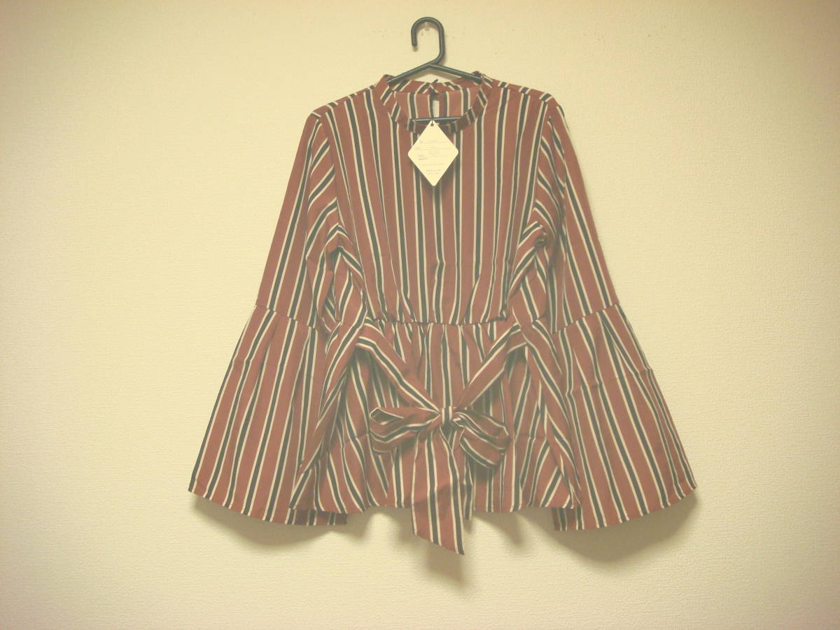 大きいサイズの方にも ストライプ おリボン付き ベルスリーブ ブラウス 赤茶系 タグ付き未使用 新品