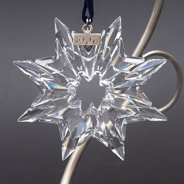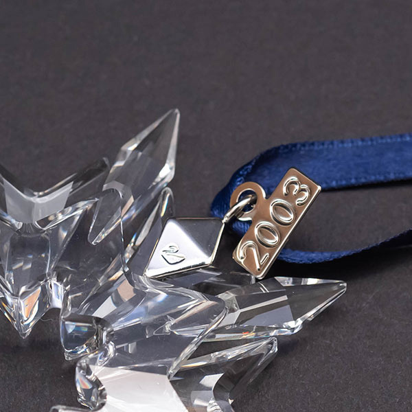 オーストリアのクリスタルガラスメーカー、スワロフスキーのクリスマスオーナメントのスノーフレーク(2003年)。 1991年にスタートしたシリーズで、毎年異なるデザインのスノーフレーク(雪の結晶)が発表されます。キャンドルの炎を受けて美しく輝くオーナメントを作りたいというのがはじまりだったそうです。どの角度から眺めてもキラキラと美しく輝いて見えます。(スタンドは付属しません) ■サイズ 横幅75 × 高さ75mm ■付属品 箱、シオリ、リボン ■状態 A(美品):使用感のない、非常に状態の良いお品物です。 |