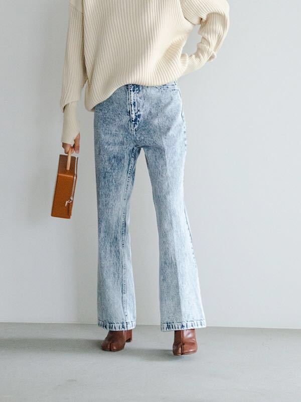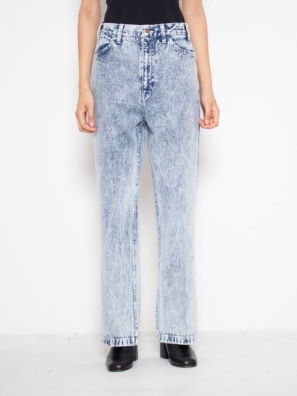 ブリーチ加工でユーズドのケミカルウォッシュの様な表情に仕上がっています。シルエットもシューカット気味になっています。中肉薄手な一般的デニム地です。