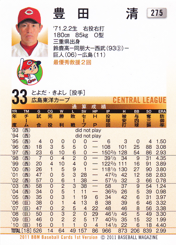 2011BBMベースボールカード1st 275 豊田清 広島 三重県 鈴鹿高校 同朋大学 西武 巨人 最優秀救援