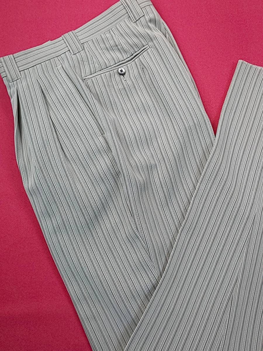 特徴      サラッとした生地でライトグレー地に黒でのおうとつ感あるストライプ柄ジャガード織りのオシャレな三ッ釦スーツです。