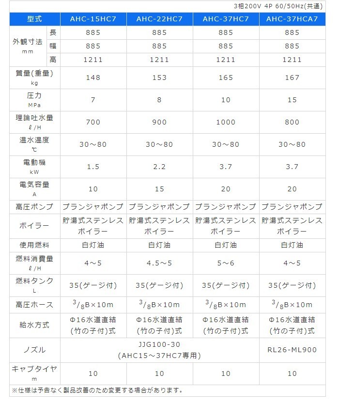 【商品詳細】 【有光 高圧洗浄機 AHC-37HC7 200V高圧温水タイプ】 外観寸法 mm 長 /幅 /高: 885×885×1211 質量(重量) kg:165 圧力 MPa : 10 理論吐水量 l/h :1000 温水温度 ℃: 30~80 電動機 kW: 3.7 電気容量 A: 20 高圧ポンプ: プランジャポンプ ボイラー :貯湯式ステンレスボイラー 使用燃料: 白灯油 燃料消費量 l/h: 5~6 燃料タンク L: 35(ゲージ付) 高圧ホース: 3/8B×10m 給水方式: Φ16水道直結(竹の子付)式 ノズル: JJG100-30 (AHC15~37HC7専用) キャブタイヤ m: 10 ■写真は、イメージです。 メーカーホームページはこちらから有光工業株式会社 重量物は法人様のみ車上渡し元払いになります。 個人様は、運送会社様の営業所止めになります。 ※仕様は予告なく変更になることがございます。 ※下記注意事項の確認をお願いいたします。