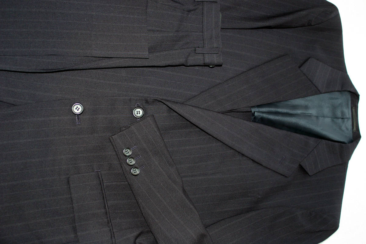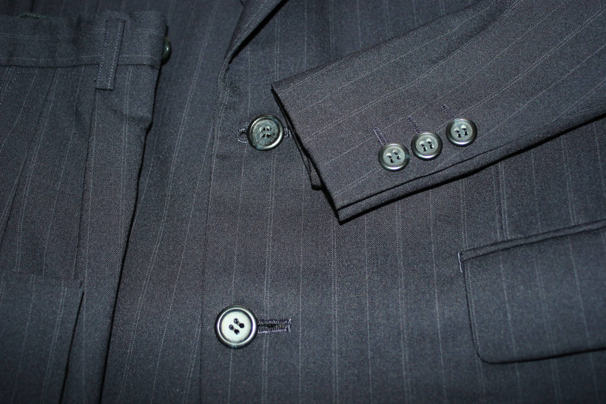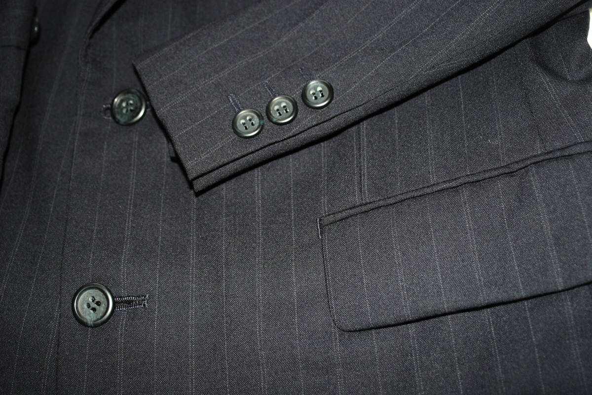 素材  毛100%                色濃紺ストラィプ                  サイズ表記    94 YA7              胸囲94-胴囲80-身長180                  (平置き寸法参考にして下さい。)