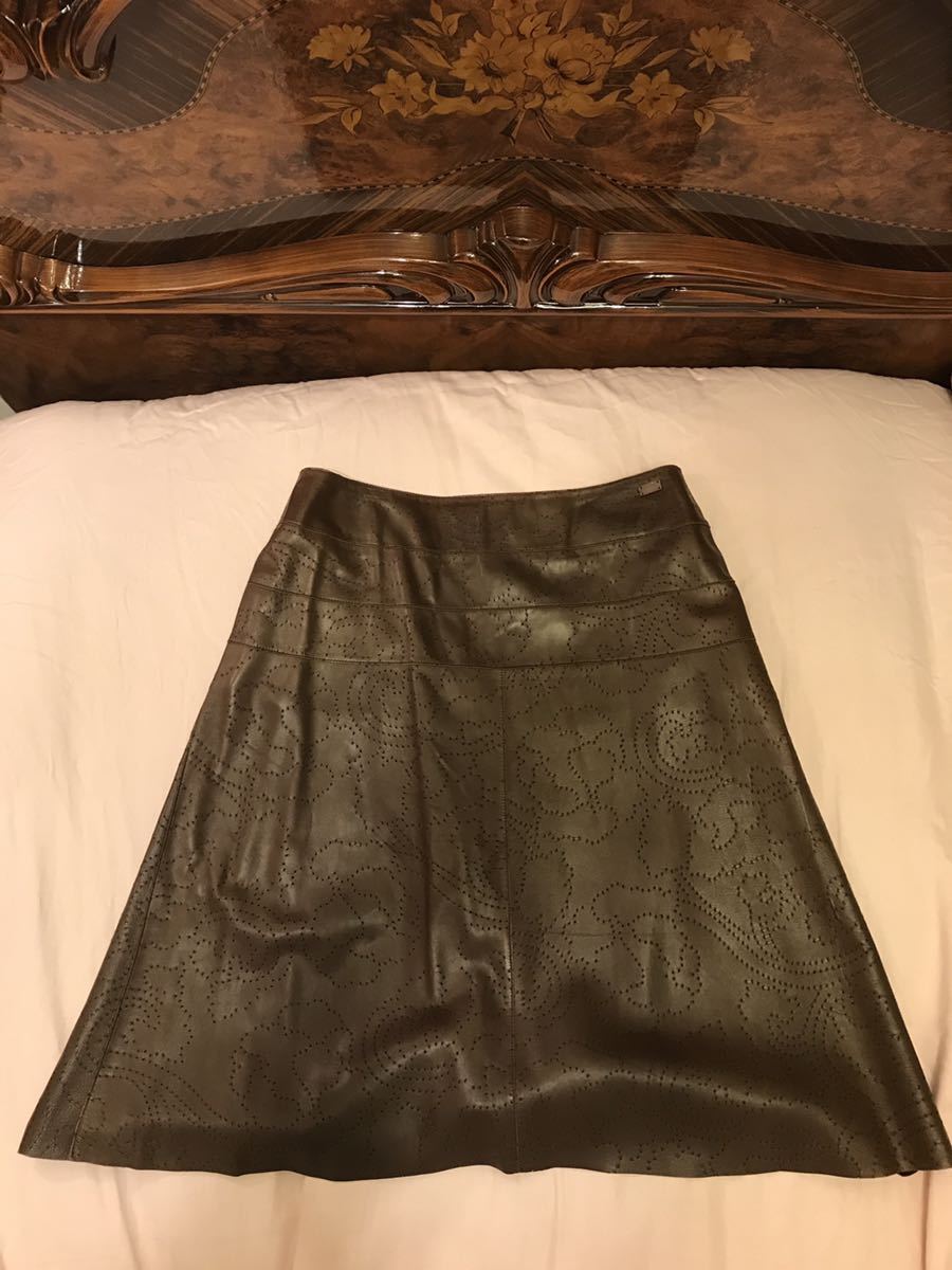 ★★★フェミニンで大人可愛い最高級正規品CHANEL lambskinカメリアパンチング柄 Aラインスカートでございます。大変高価、かつ超レアなデザイン、末永くお召し頂けるかと存じます。ご検討くださいませ。