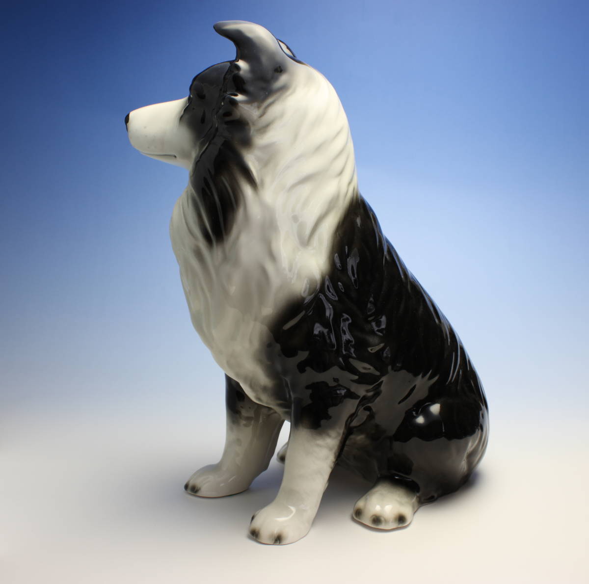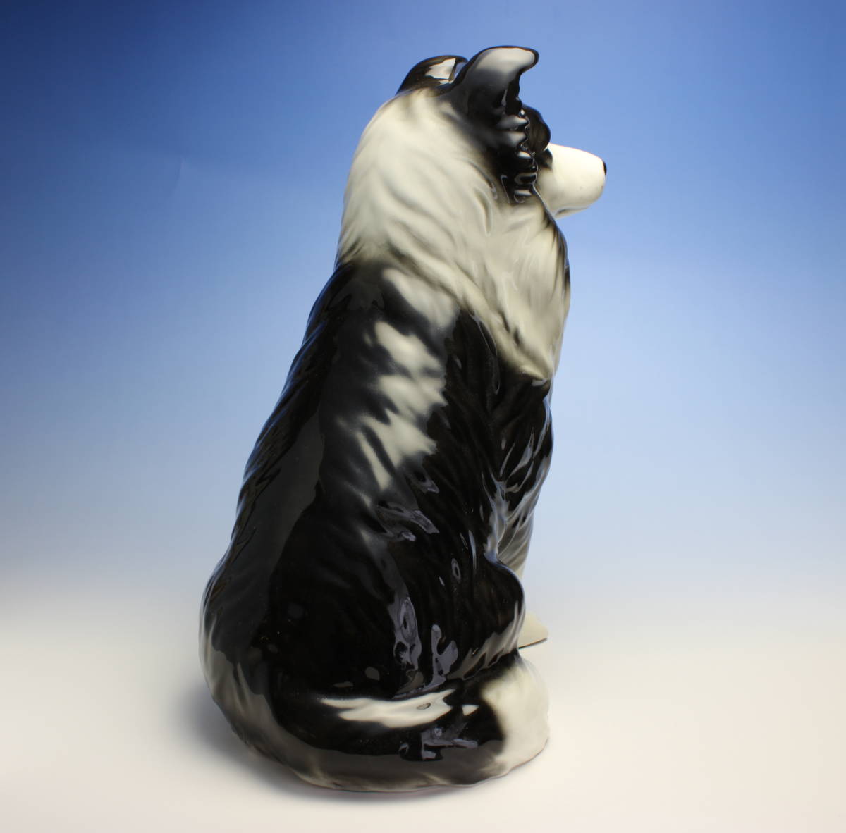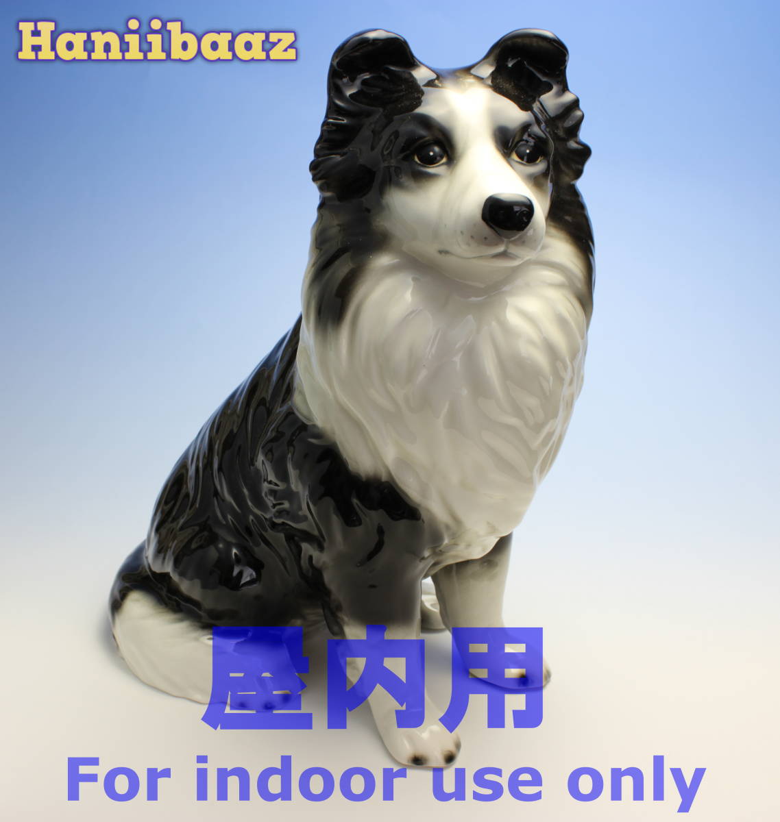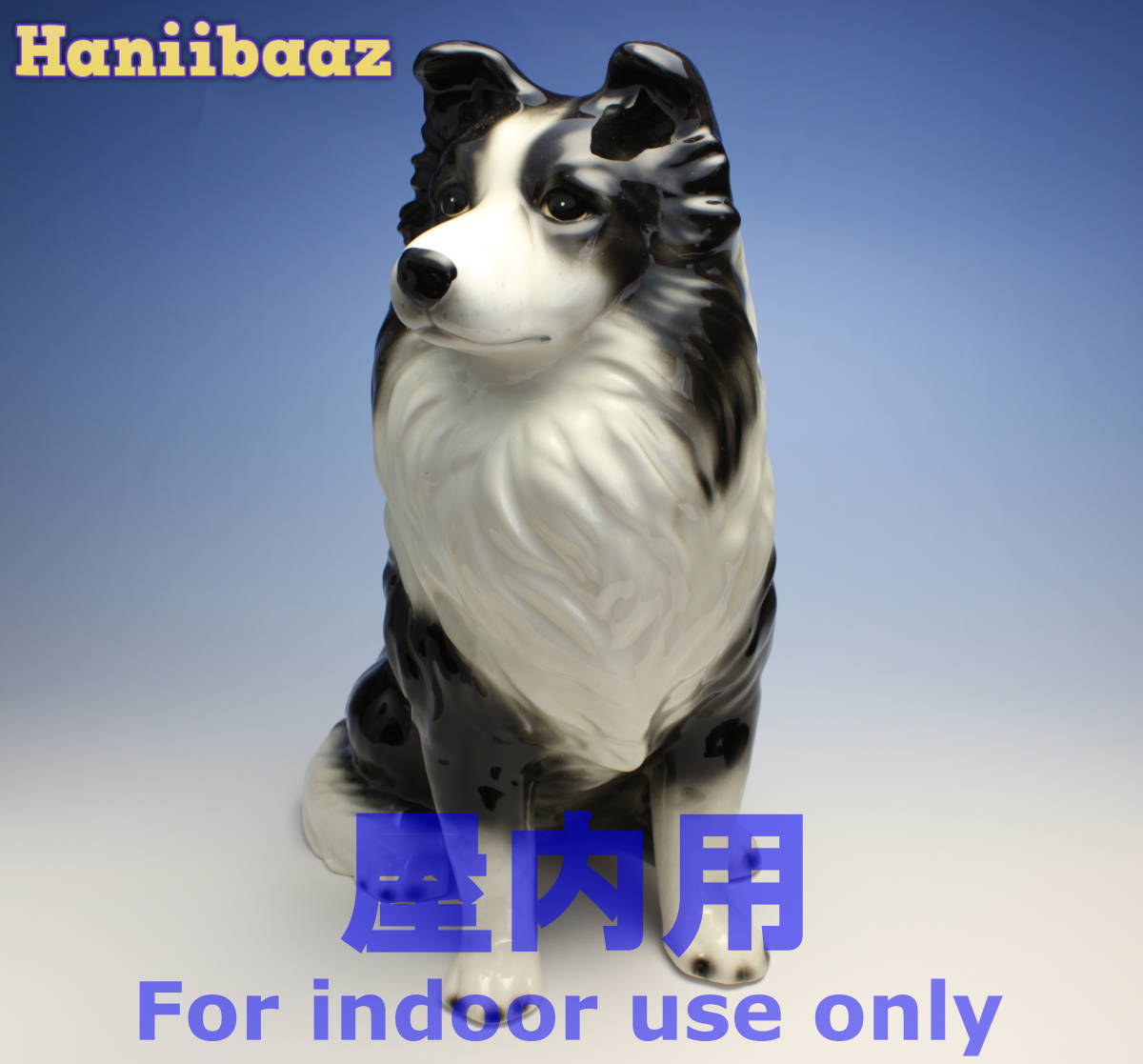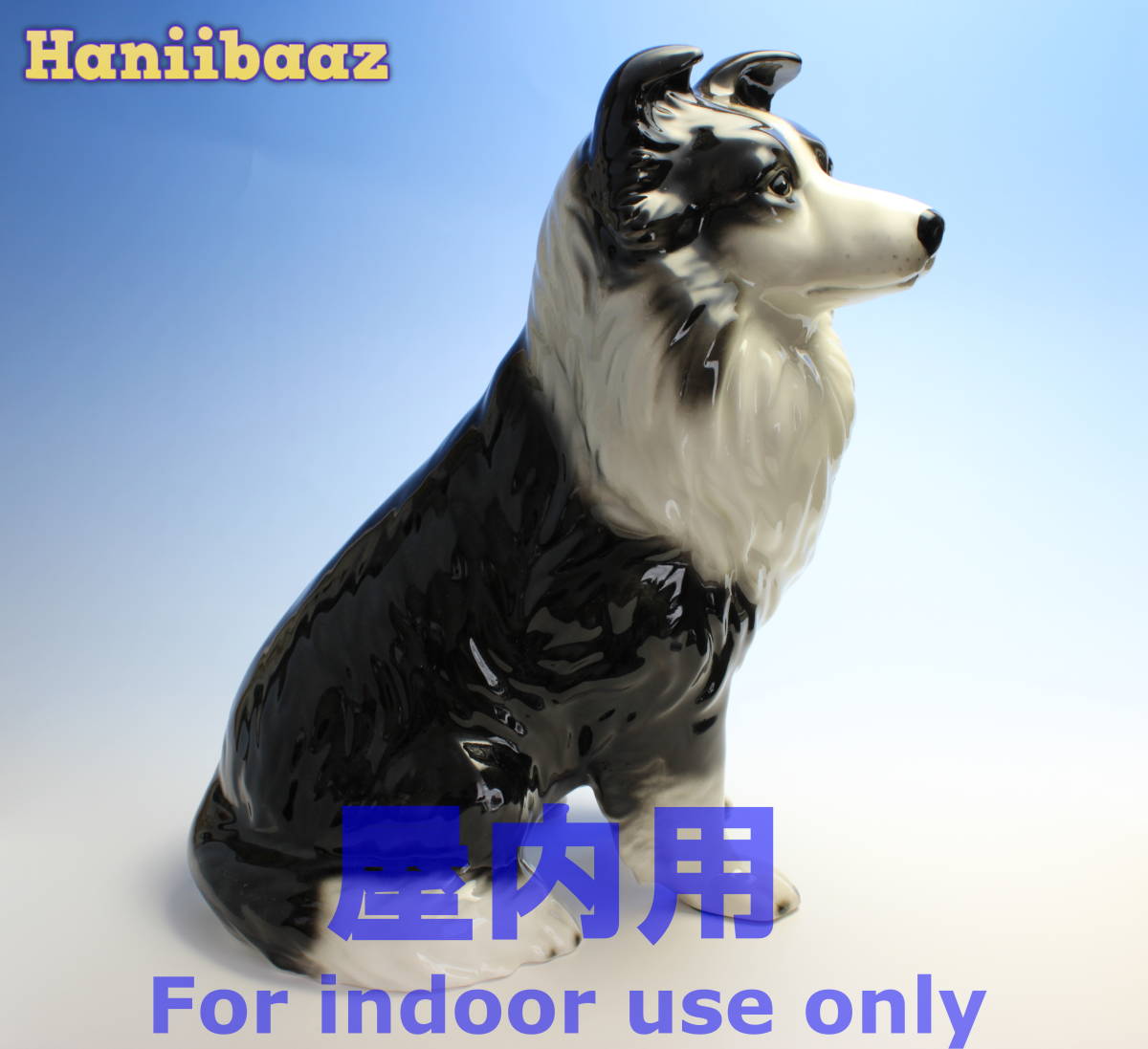 陶器製の犬置物 ボーダーコリー (大) おすわりポーズサイズ 長さ27 ㎝x高さ32 ㎝(写真の定規はインチ目盛りです)