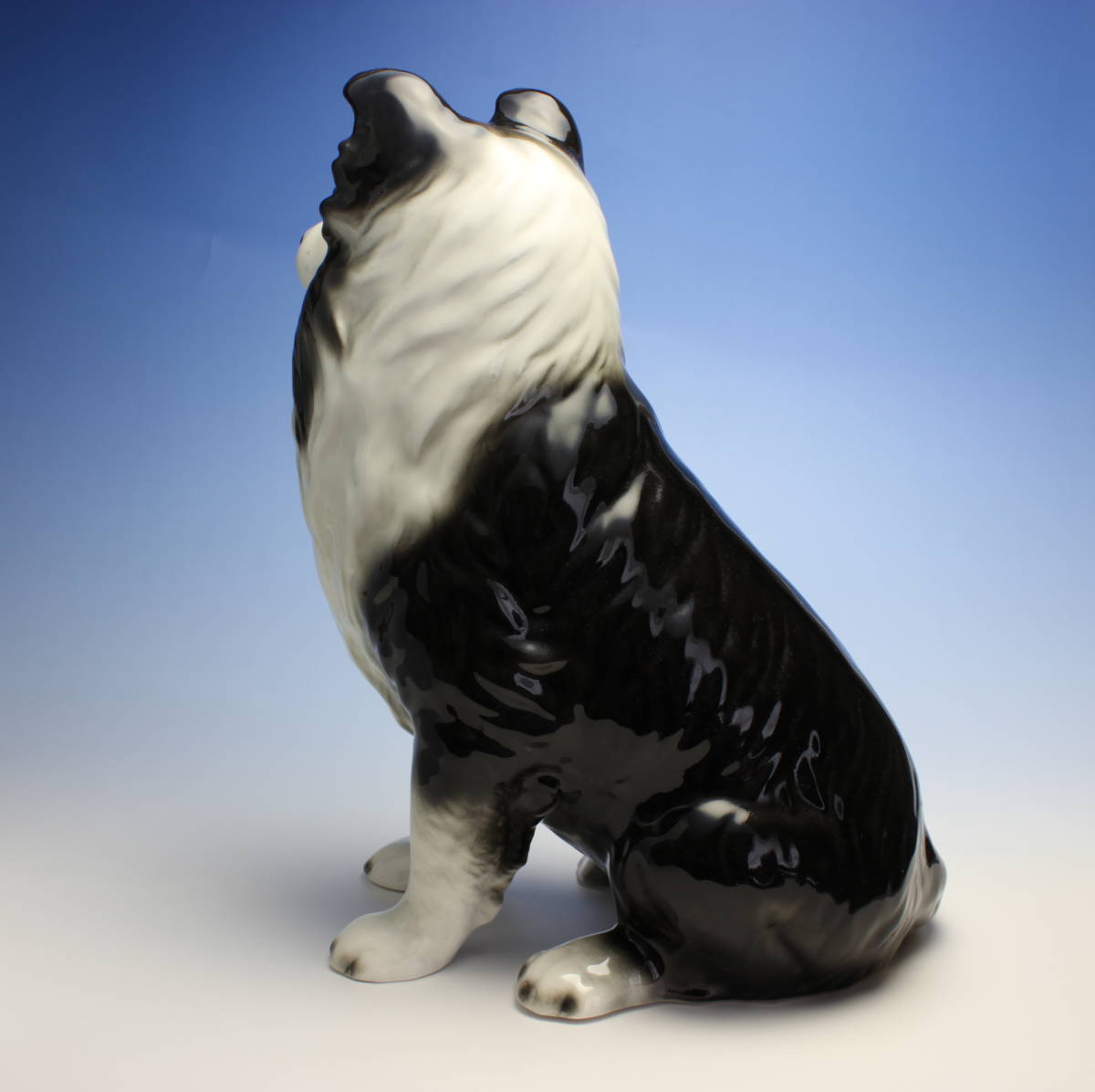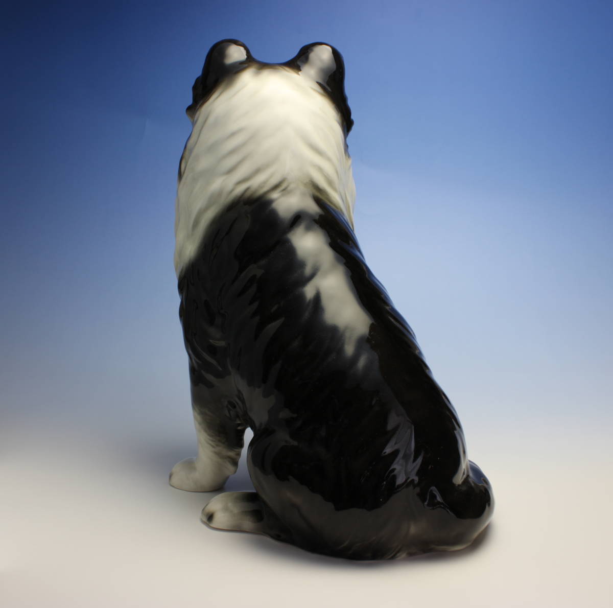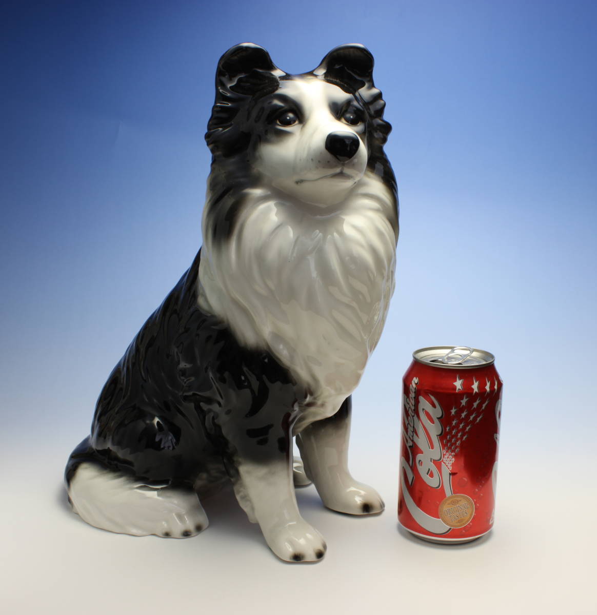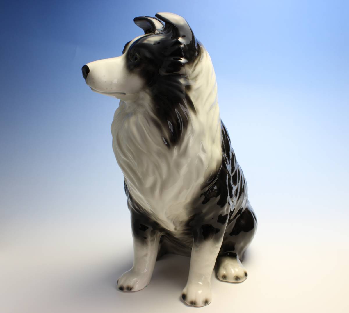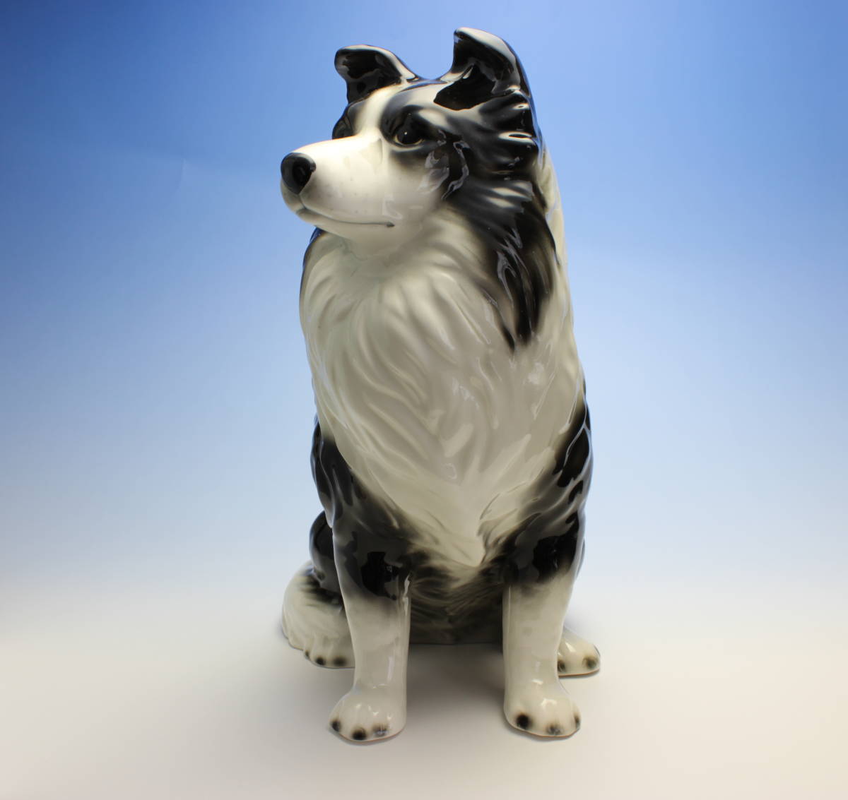 陶器製の犬置物 ボーダーコリー (大) おすわりポーズサイズ 長さ27 ㎝x高さ32 ㎝(写真の定規はインチ目盛りです)