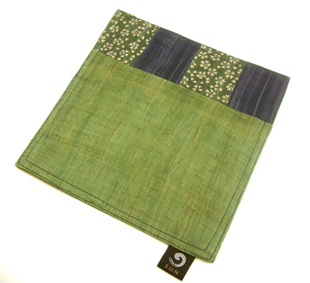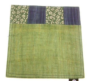 ●片面は、ジュート素材のオリーブグリーン×綿素材の濃紺無地×綿素材グリーン地に生成り色桜小花のパッチワーク