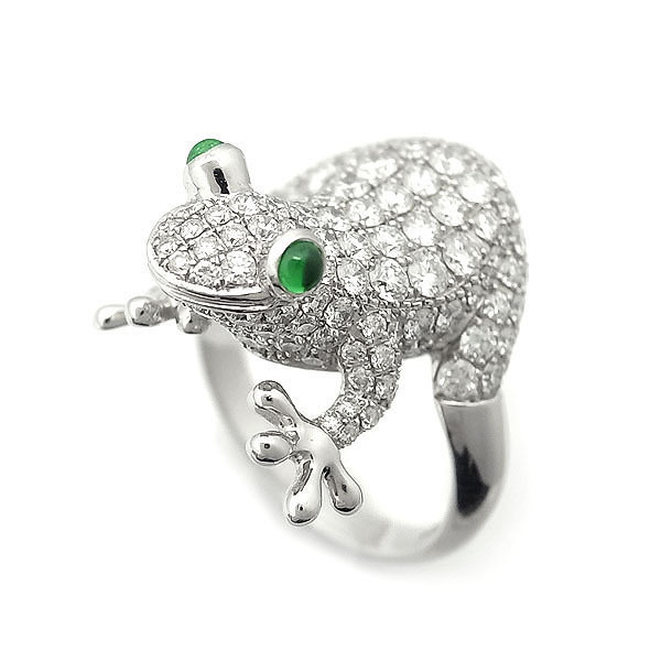 コメント 世界中のジュエラーから大きな評価を得ている、ドイツのハイクオリティジュエリーブランド「ステンツホーン(STENZHORN)」。厳選された宝石を熟練の職人たちが一つ一つ丁寧に造り上げるジュエリーは高い精度と高品質を約束されます。伝統的な技法を用い、シルクの様に滑らかに製造されたジュエリーは、ステンツホーンの唯一無二の最高級品です。日本や海外でも幸福をもたらすと言われる両生類のカエル(蛙/Frog)モチーフのリング。ちょこんと指に乗っているようなデザイン、笑っているような表情がなんとも可愛らしい指輪です。ホワイトゴールドで表現されたカエルモチーフの体には優雅に煌めくダイヤモンド(合計1.55ct)両目には鮮やかな輝きを放つツァボライト(グリーンガーネット・合計0.10ct)を施し、今にも動き出しそうな躍動感を感じられます。
