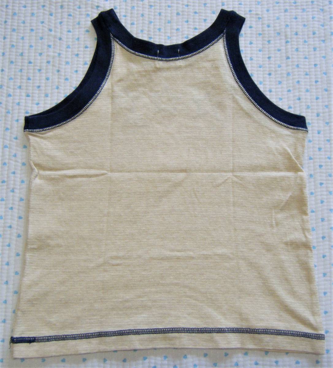 本体は綿素材。  軽量で柔らかな生地を使用し、胸にはロゴ刺繍されたカジュアル用タンクトップシャツ・Tシャツ。   胸元のロゴ、文字は刺繍。   MADE IN JAPAN / 日本製    カラー ベージュ系  リブ部はネイビー