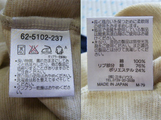 品質/素材  本体:綿 100%  リブ部分:綿 76%、ポリエステル 24%   モデル番号 62-5102-237      発売元 (株)ミキハウス