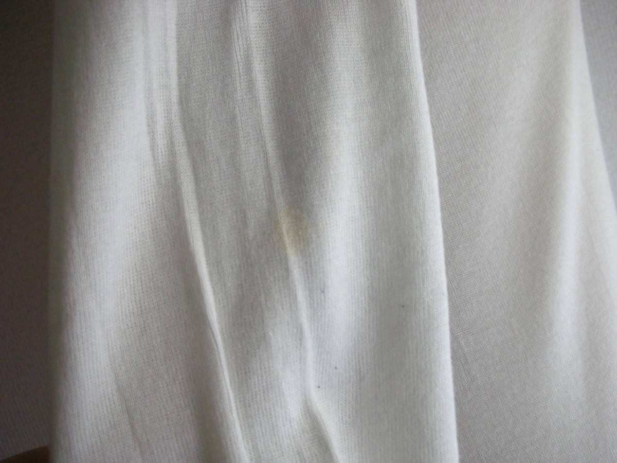 袖部分に1ヶ所シミがあり、首部分に薄い黄ばみがあります。