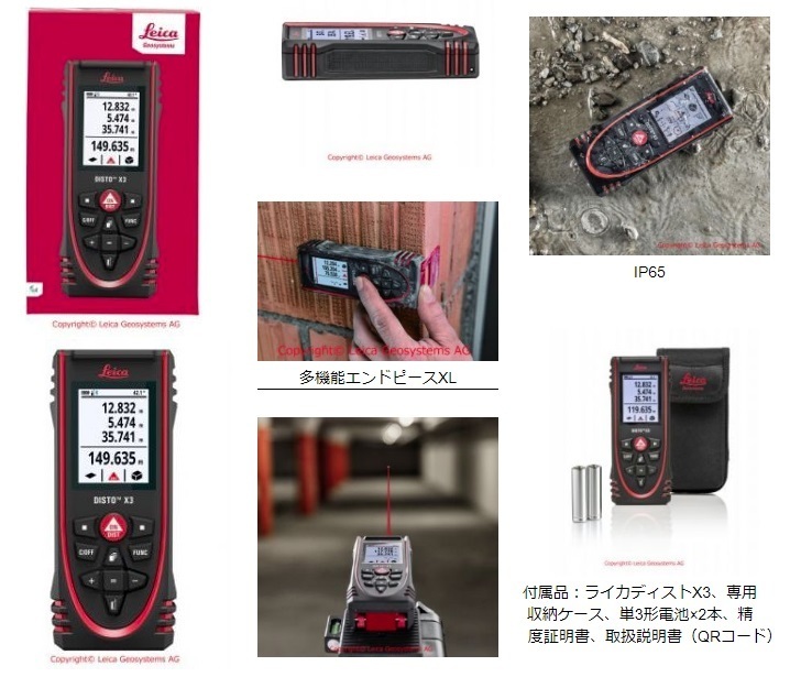 タジマ TAJIMAレーザー距離計ライカディストX3商品コード:DISTO-X3ブランド:ライカ製品重量:184g■機能・業界最強のIP65。耐落下衝撃性能に優れたボディ・専用アプリLeica DISTO PlanTMによりスマートフォンやタブレットと連携・別売のライカDST360アダプターと組み合わせて3次元測距も可能に・面積・体積設定、ペインだー機能、水平距離測定、ピタゴラス測定、ステイクアウト・X-Range Power TecnologyTMにより、周囲が明るいなど測距に適さない環境下での測定時にも高いパフォーマンスを実現・Bluetooth SMART機能搭載・2インチディスプレイ■仕様規格:国際標準化機構規格ISO16331-1適合品保証:3年間保証(WEB登録)標準測定範囲:0.05m~150mP2P測距精度:±10mm/10m ※別売のDISTO-DST360が必要です防塵・防水性能:IP65インターフェース:Bluetooth?SMART電源:単3形乾電池×2本画像取扱い:本ウェブサイトページに記載の製品情報および画像の著作権はLeica Geosystems AGに帰属します。■素材外装:ABS樹脂・エラストマー樹脂