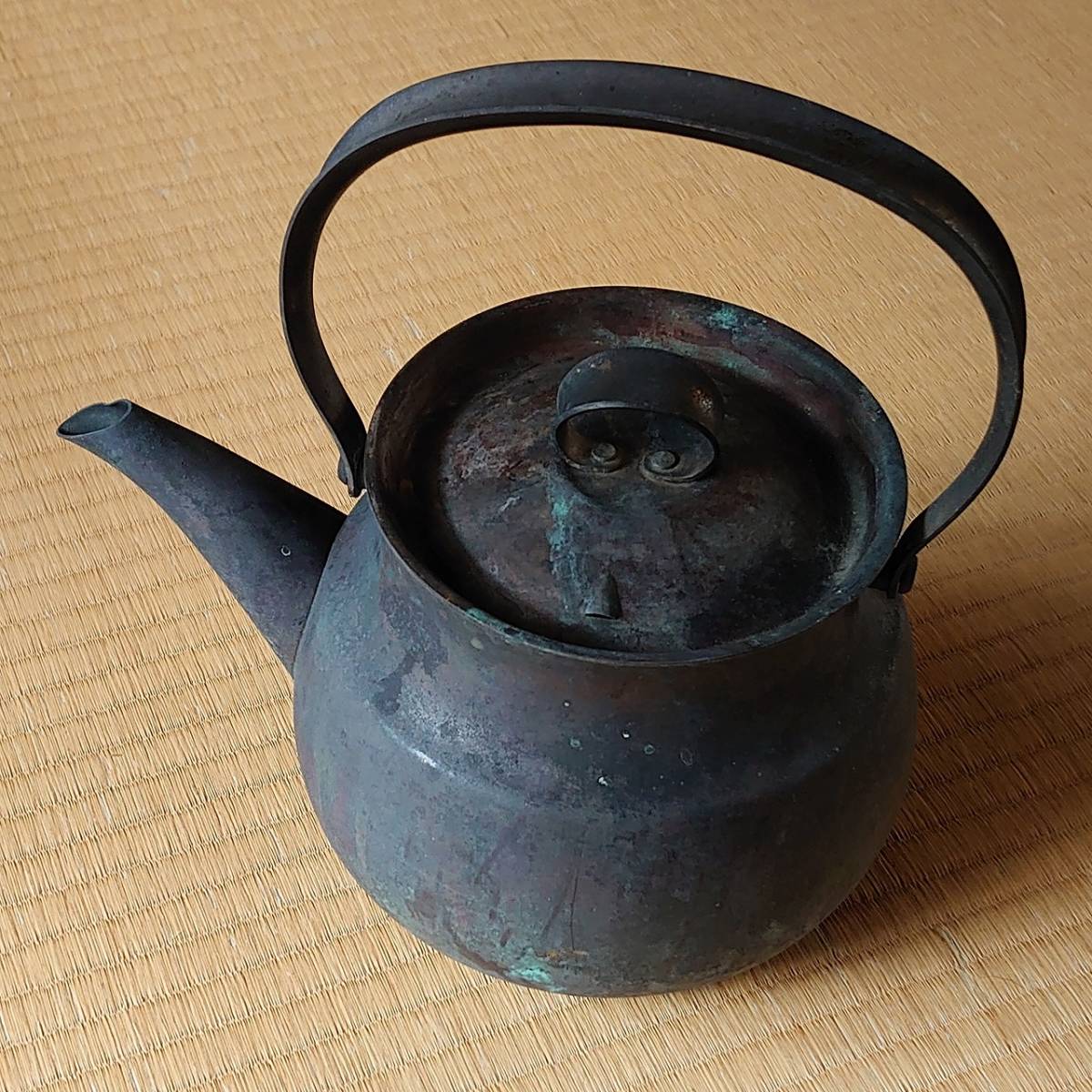古いヤカン 銅製 全長約240㎜ 高さ約135㎜(蓋・柄を含まない)凹みあり 古物 古道具 骨董 古民家