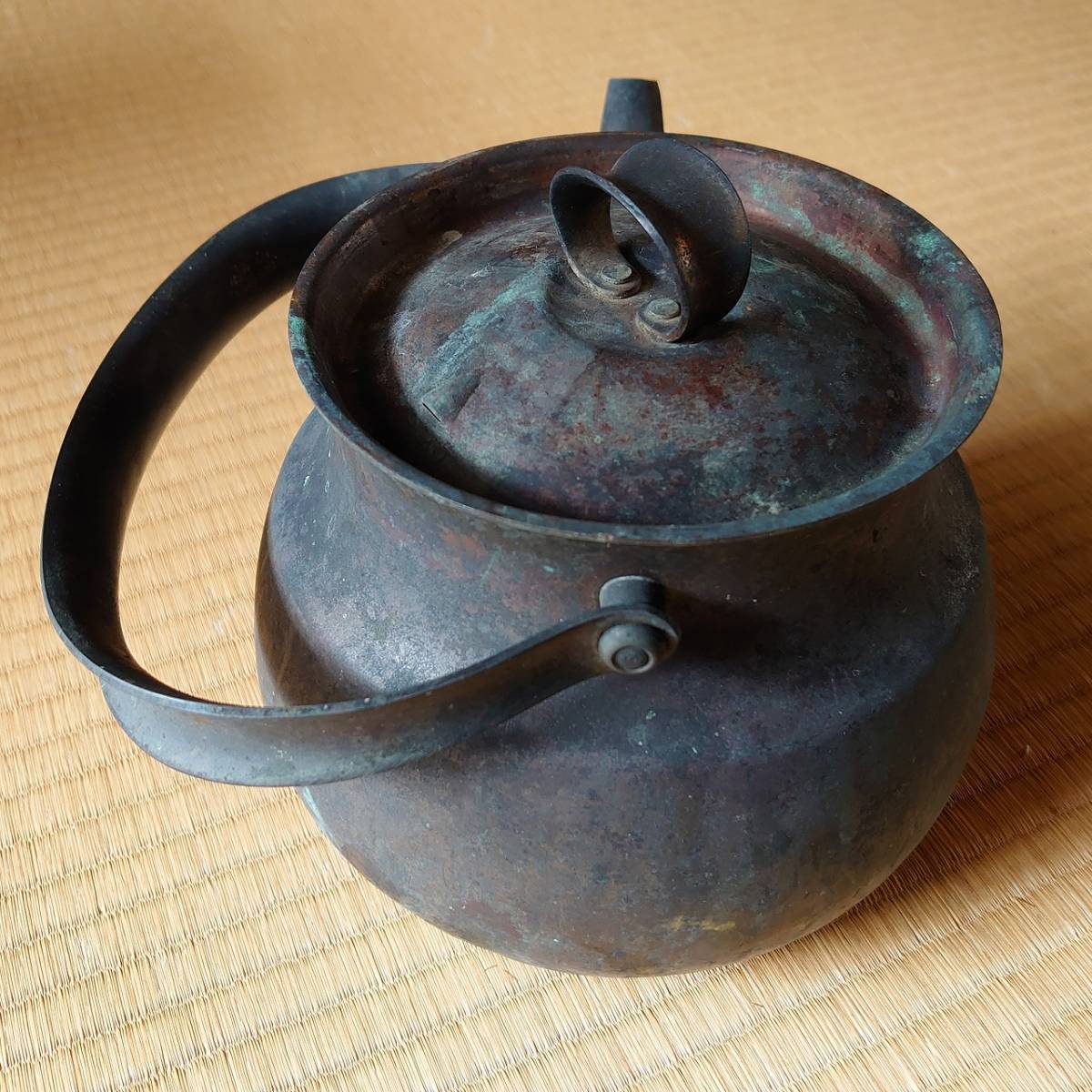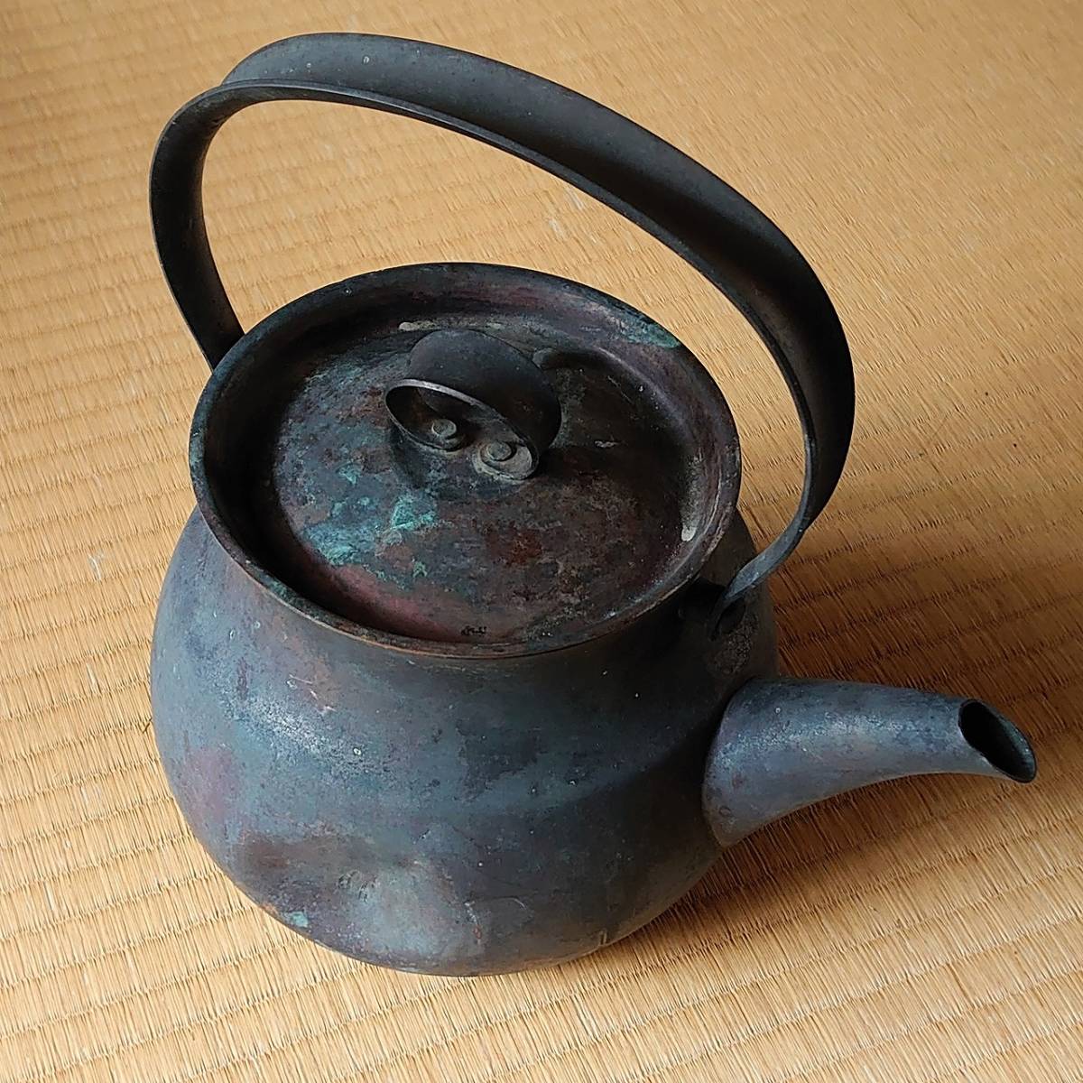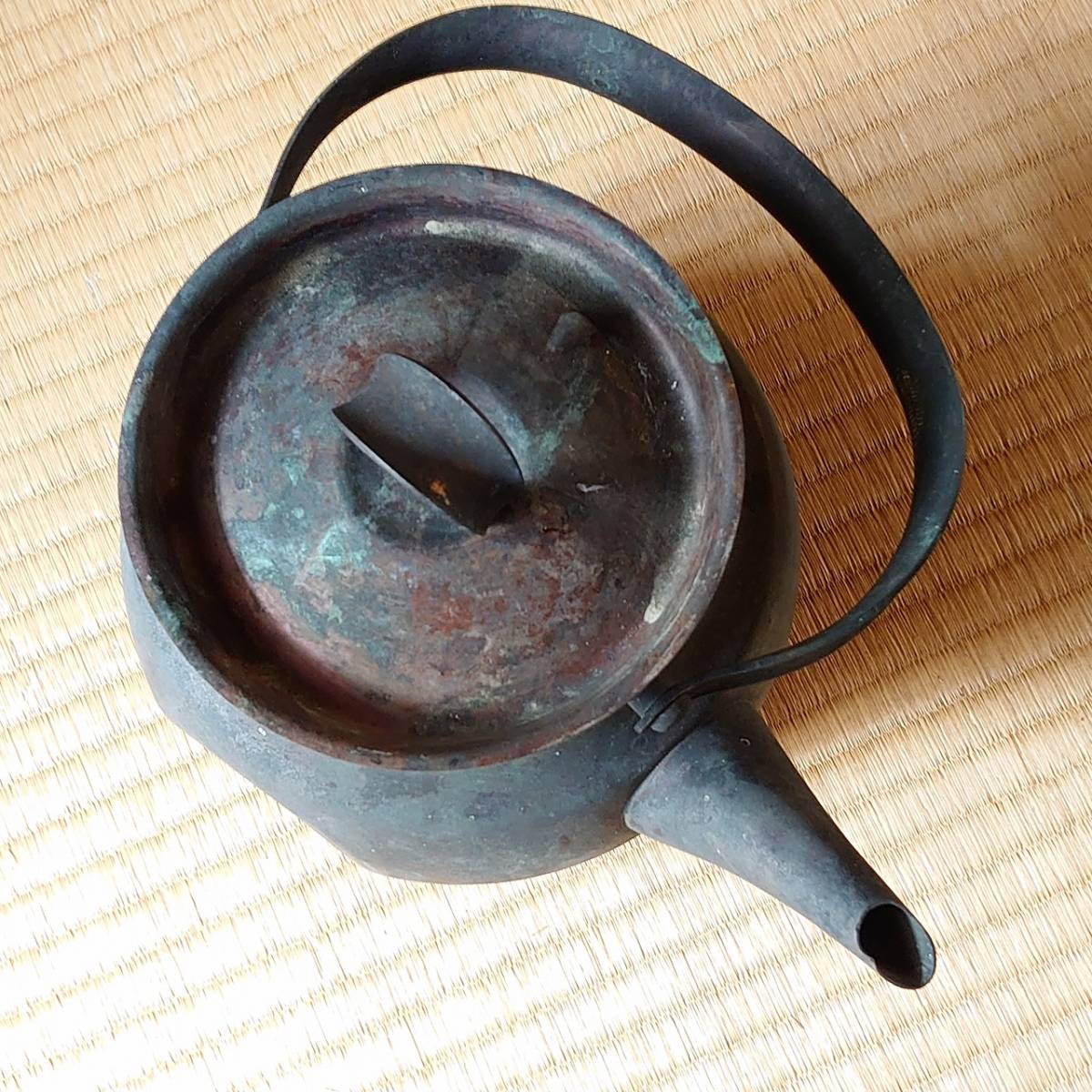 古いヤカン 銅製 全長約240㎜ 高さ約135㎜(蓋・柄を含まない)凹みあり 古物 古道具 骨董 古民家