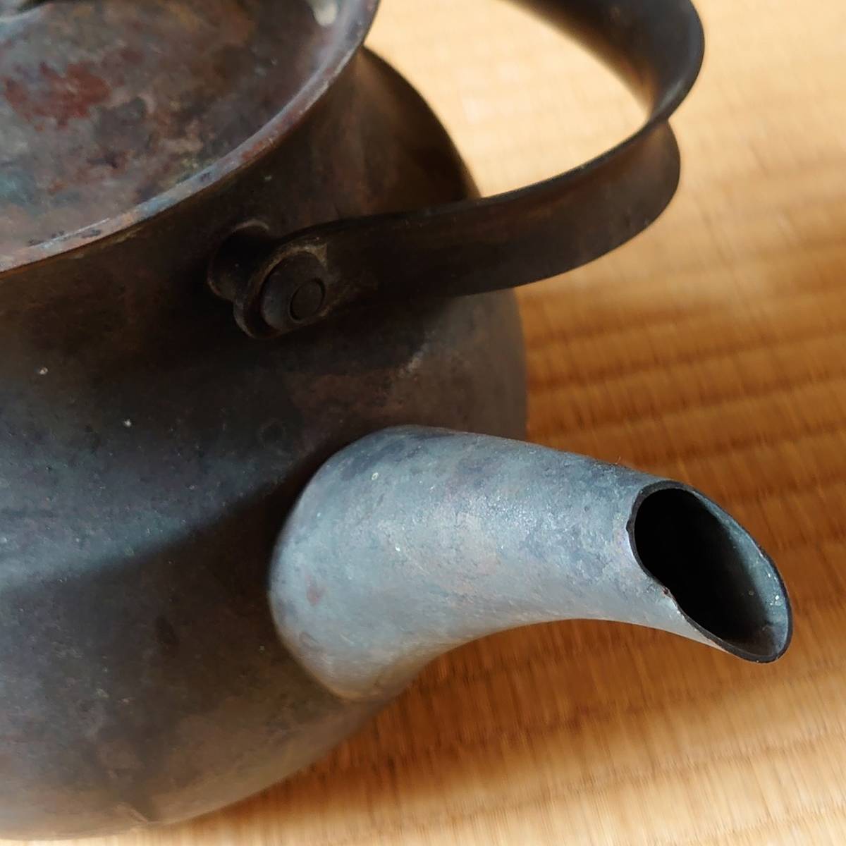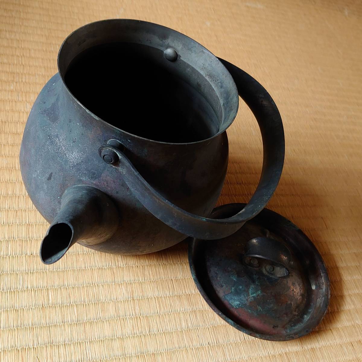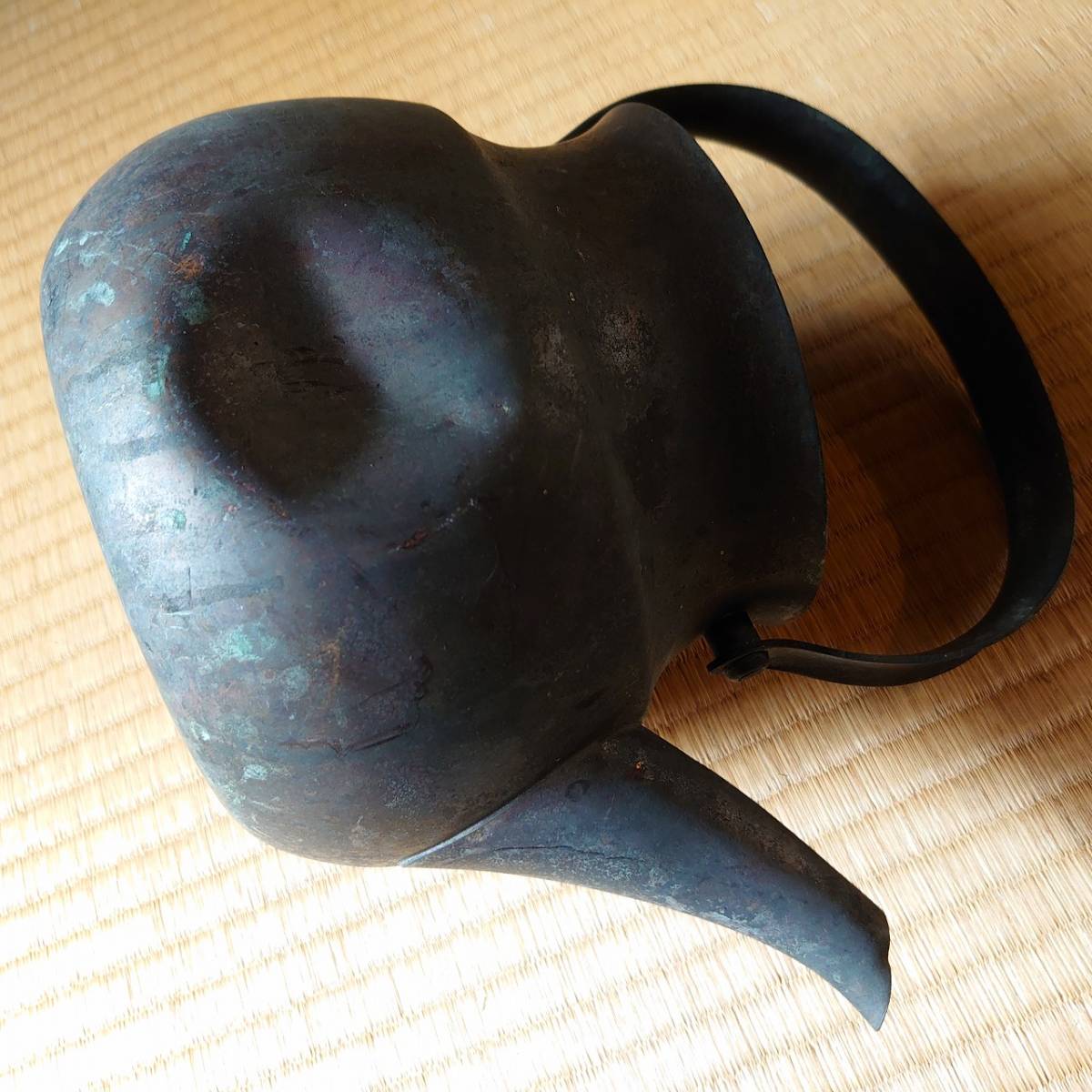 古いヤカン 銅製 全長約240㎜ 高さ約135㎜(蓋・柄を含まない)凹みあり 古物 古道具 骨董 古民家