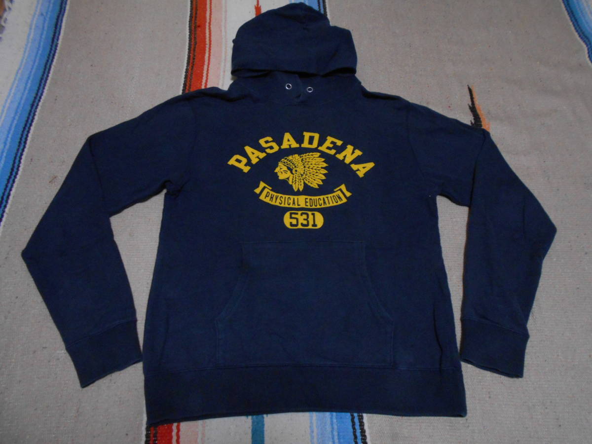 1960S 特有の厚みを抑えたビンテージ コットン100%スウェット素材感、風合い有る ネイビー× 原色イエロー のカラーマッチ、タイト目なボディーとスリーブシルエット、ハンドウォーマー侵入口エッジ上下カンヌキ補強、クラシック フェルトプリント PASEDENA PHYSICAL EDUCATION  クラシックロゴ と ナンバリング、ネイティブアメリカンエンブレムの入り方  等等...拘り有るディテールが極めて良いテイスト