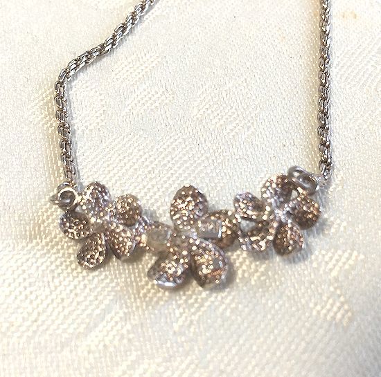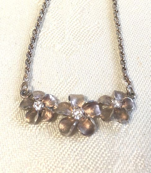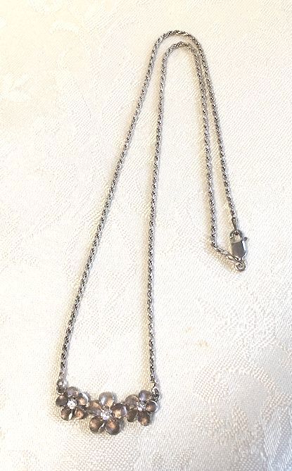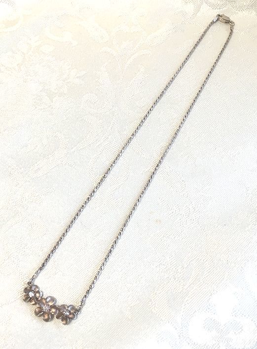 ◎イタリー製の美しいフラワーモチーフのネックレスです。シルバー925素材にモチーフ部はピンクゴールドメッキが施され、中央のスリー・ストーンが煌めいて綺麗です。ストーンはダイヤでは無く、キュービックジルコニアかスワロフスキークリスタルのどちらかだったと思います。厚みのある立体的なモチーフが胸元で品格のある存在感を放ってくれると思います。大切にしておりましたがアクセサリーの整理中で、迷った末の出品です。如何でしょう★