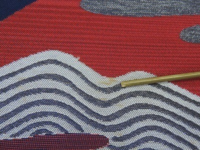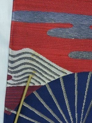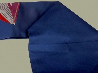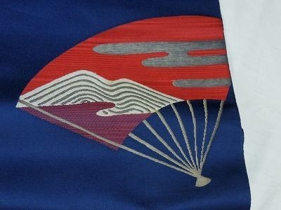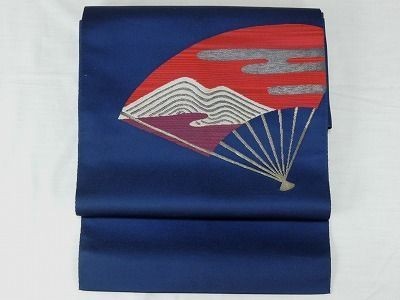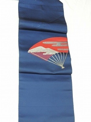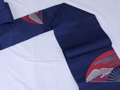 名古屋帯 化繊 紺色 扇 お太鼓柄 中古 n67★喜香★