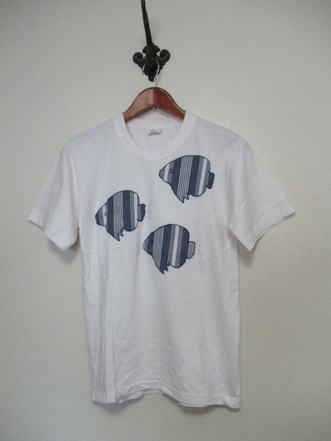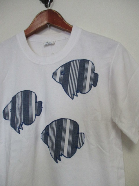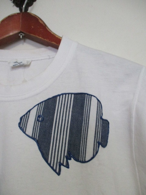 | 商品紹介 | 本体とは別布を使った魚のワッペンが ポイントになったTシャツです。 地色は白で、ワッペン生地はネイビーと白のストライプ柄です。 《素材》 コットン100% |
