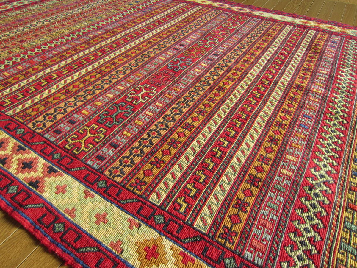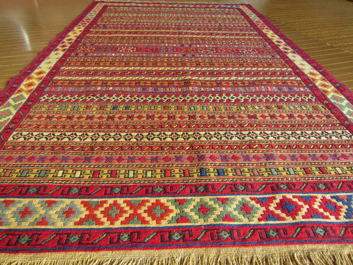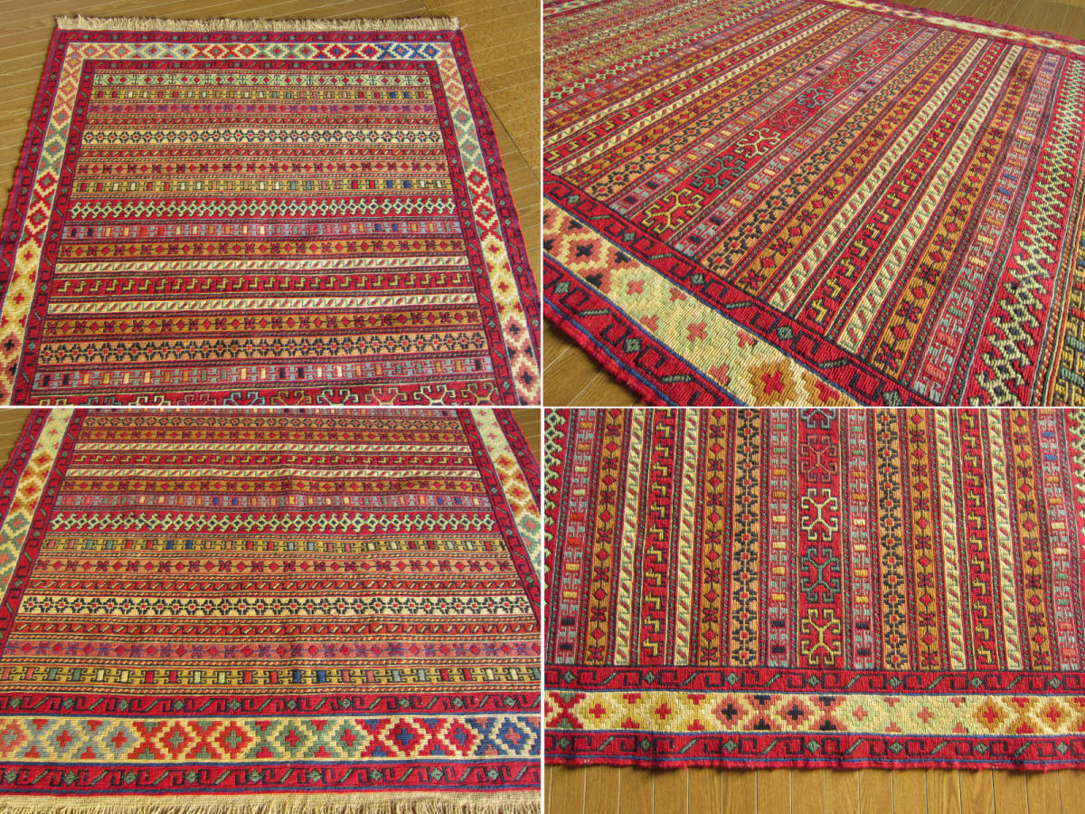 商品説明 | ★素材 : ウール・手織り・スマック織り ※スマック織りとは、イランのキリムの織り方の技法です。 土台の縦糸と横糸の上にもう一本横糸を絡めるように 巻き込んで織っていく高度なテクニックで、 刺繍のように細かな文様を描けることができます。 スマック織りは裏面に模様の糸を渡してあるので 片面使いのキリムになります。 ★サイズ : 約 200×126 cm (房を含まない長さです) ★産地 : イラン・アゼルバイジャン ★状態 : 新品 kxpgs342+ZIBACARPET絨毯 kxpgs342+ZIBACARPET取扱いペルシャ絨毯 FARSHEZIBA_KILIMキリム |