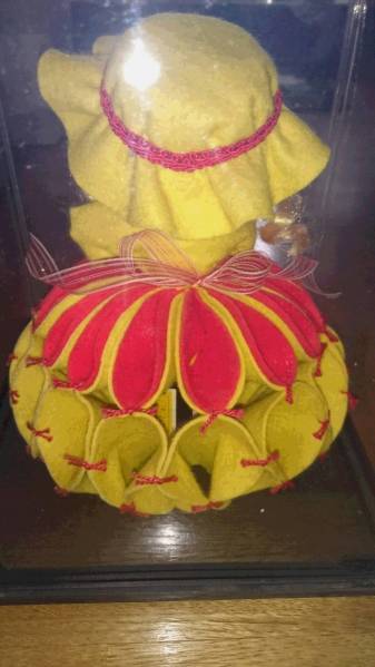 黄色いフェルトのドレスを着た可愛らしい少女人形(約22cm)+ピンク色のスピッツ人形(約12cm)のセット。