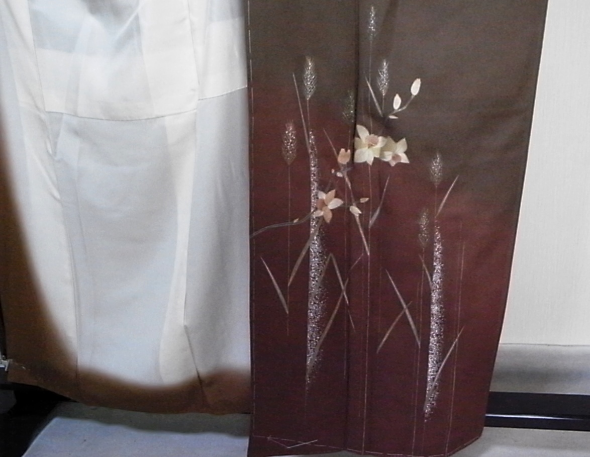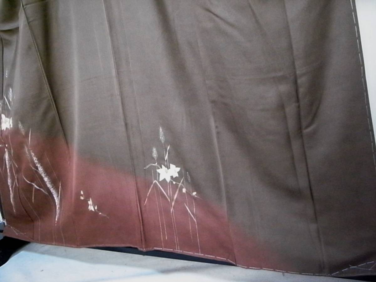 正絹なし地ちりめん 濃茶色地・裾ぼかし桔梗柄模様