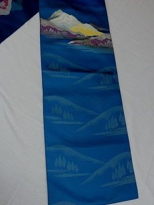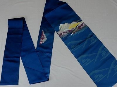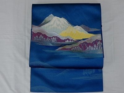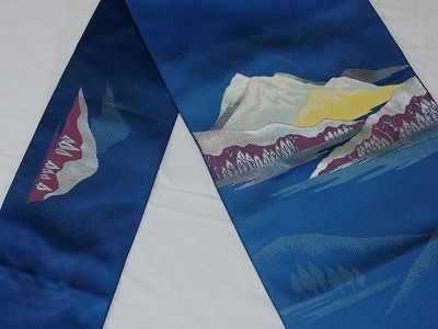 名古屋帯 正絹 藍御納戸色 お太鼓柄 風景文様 中古 n74★喜香★