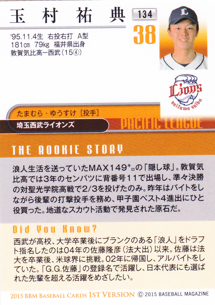 BBM2015ベースボールカード1st 134 玉村祐典 福井県 敦賀気比高校 ルーキー 埼玉西武ライオンズ